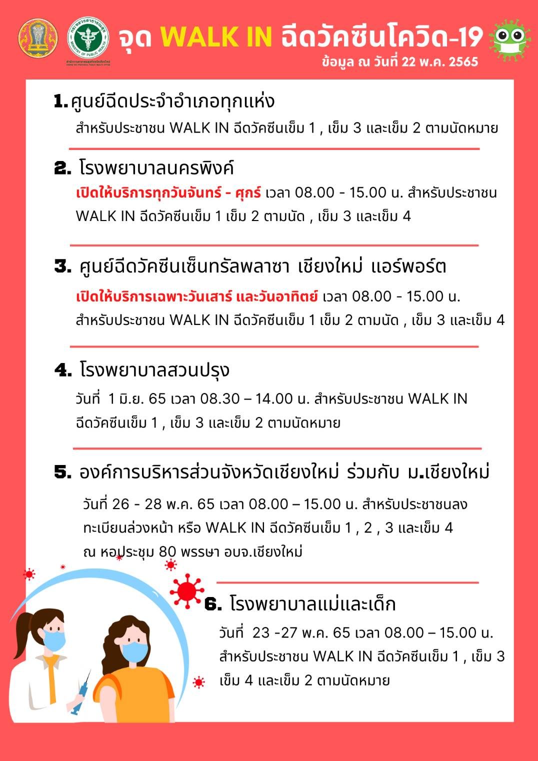 จุด WALK IN ฉีดวัคซีนโควิด-19 ข้อมูล ณ วันที่ 22 พ.ค. 2565