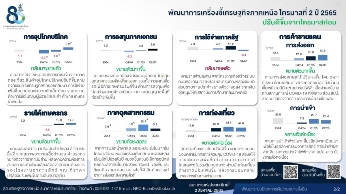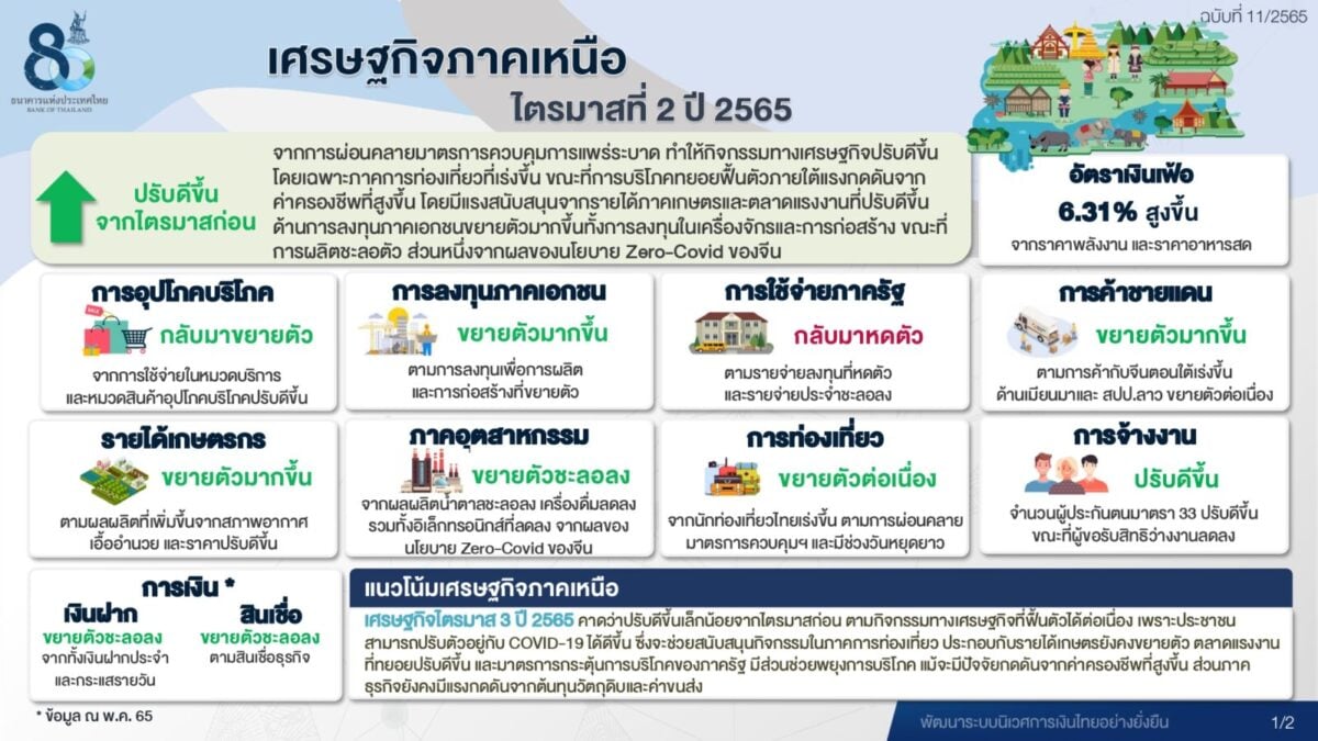 สำหรับแนวโน้มเศรษฐกิจภาคเหนือ ในไตรมาส 3 ปี 2565 คาดว่าปรับดีขึ้นเล็กน้อยจากไตรมาสก่อนตามกิจกรรมทางเศรษฐกิจท่ีฟื้นตัวได้ต่อเนื่องเพราะประชาชน สามารถปรับตัวอยู่กับ COVID-19 ได้ดีข้ึน ซึ่งจะช่วยสนับสนุนกิจกรรมในภาคการท่องเที่ยว ประกอบกับรายได้เกษตรยังคงขยายตัว ตลาดแรงงาน ที่ทยอยปรับดีขึ้น และมาตรการกระตุ้นการบริโภคของภาครัฐ มีส่วนช่วยพยุงการบริโภค แม้จะมีปัจจัยกดดันจากค่าครองชีพที่สูงข้ึน ส่วนภาค ธุรกิจยังคงมีแรงกดดันจากต้นทุนวัตถุดิบและค่าขนส่ง