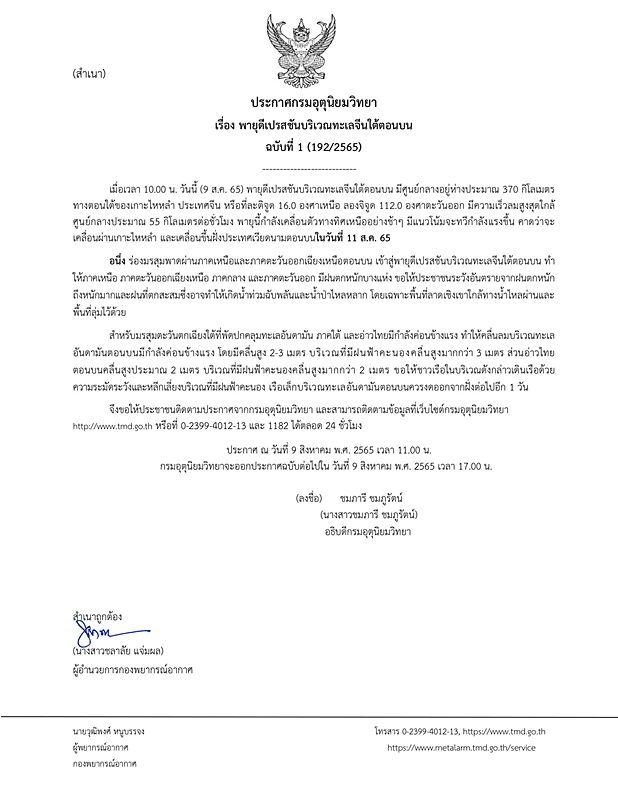 จึงขอให้ประชาชนติดตามประกาศจากกรมอุตุนิยมวทยา และสามารถติดตามข้อมูลที่เว็บไซต์กรมอุตุนิยมวิทยา https://www.tmd.go.th หรือที่ 0-2399-4012-13 และ 1182 ได้ตลอด 24 ชั่วโมง ทั้งนี้ กรมอุตุนิยมวิทยาจะออกประกาศฉบับต่อไปในวันที่ 9 สิงหาคม พ.ศ.2565 เวลา 17.00 น.