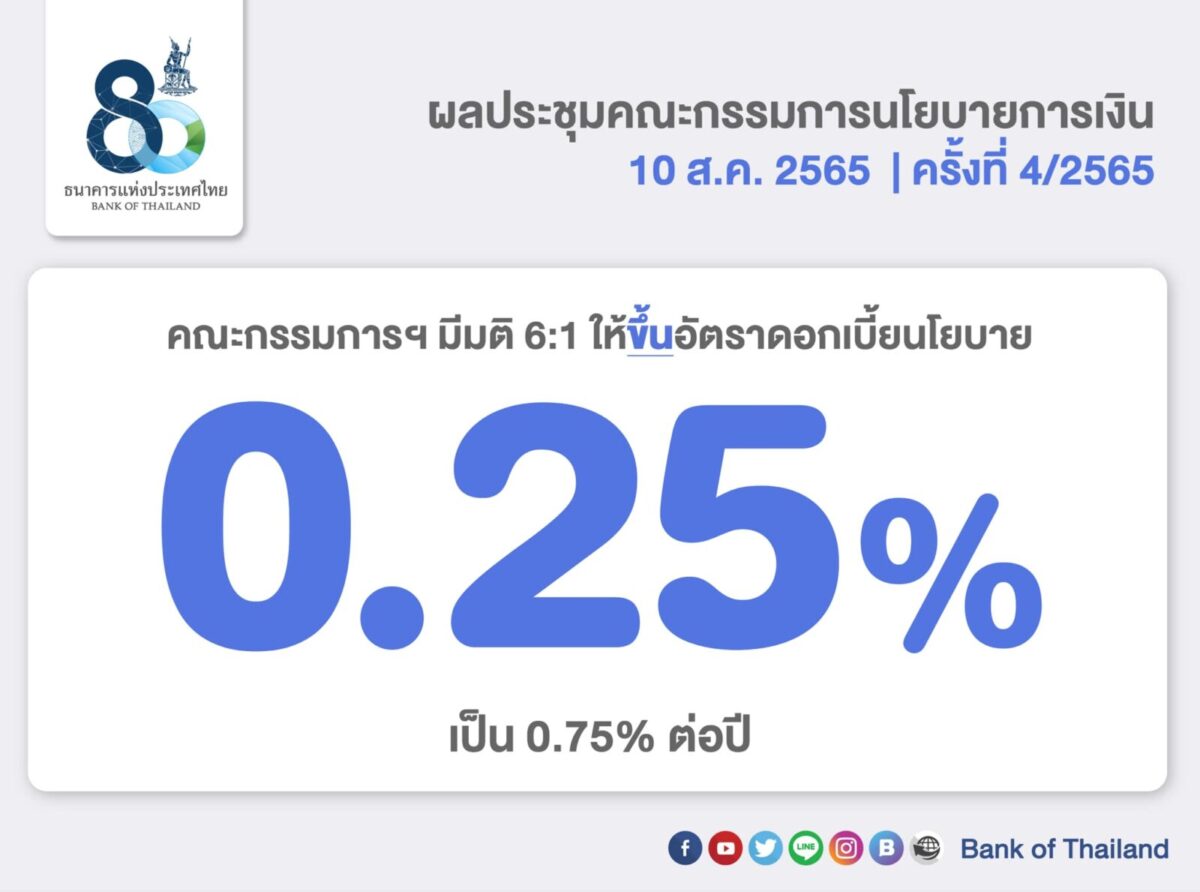นายปิติ ดิษยทัต เลขานุการ คณะกรรมการนโยบายการเงิน (กนง.) แถลงผลการประชุม กนง. ในวันที่ 10 สิงหาคม 2565 โดยทางคณะกรรมการฯ มีมติ 6 ต่อ 1 เสียง ให้ขึ้นอัตราดอกเบี้ยนโยบายร้อยละ 0.25 ต่อปี จากร้อยละ 0.50 เป็นร้อยละ 0.75 ต่อปี โดยให้มีผลทันที ทั้งนี้ 1 เสียงเห็นควรให้ขึ้นอัตราดอกเบี้ยนโยบายร้อยละ 0.50 ต่อปี