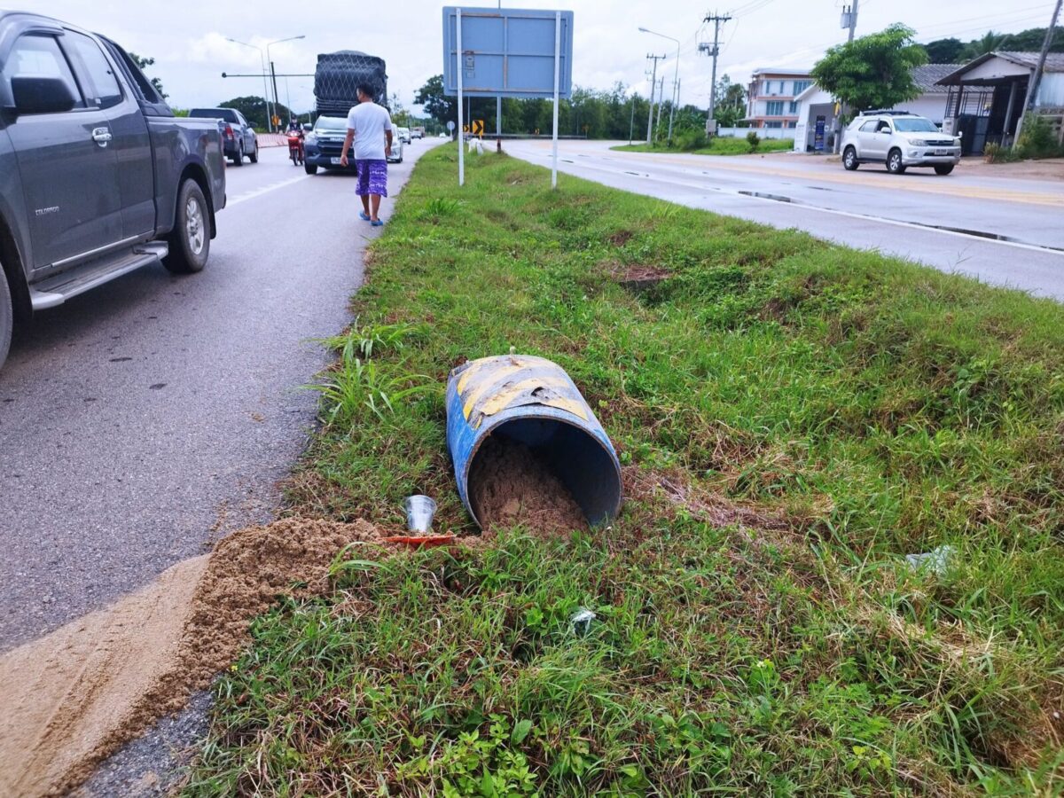 ระทึก!! กระบะชนถังบรรจุทราย น้ำหนักกว่า 100 กิโลกรัม กระเด็นฟาดใส่รถเก๋งที่ขับสวนมาอย่างแรง ชายคนขับได้รับบาดเจ็บ