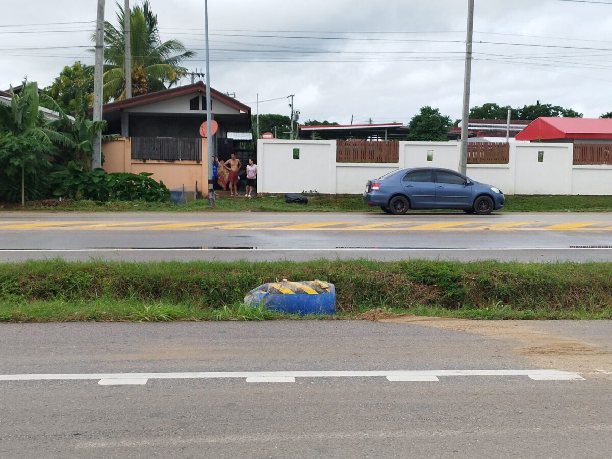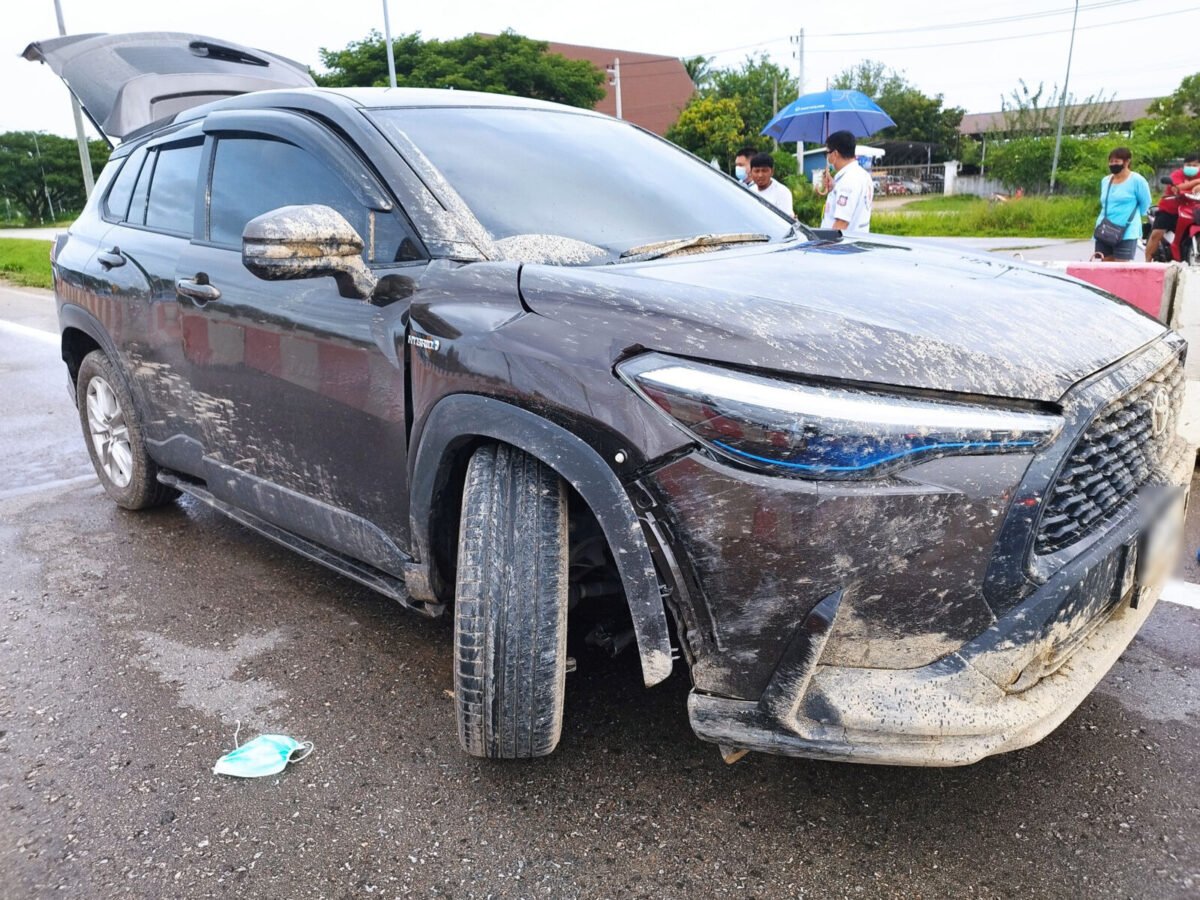 ส่วนคู่กรณีเบื้องต้นทราบว่าเป็นรถยนต์กระบะอีซูซุสีดำ ซึ่งได้จอดอยู่ห่างออกไปประมาณ 100 เมตร รถฝั่งขวาได้รับความเสียหาย พร้อมกับถังสีฟ้าบรรจุทรายน้ำหนักไม่ต่ำกว่า 100 กิโลกรัม กระเด็นข้ามฝากถนนมาตกไหล่ทางสภาพพังเสียหาย โดยเจ้าหน้าที่ตำรวจได้คุมตัวชายคนขับรถกระบะมาทำการสอบสวน