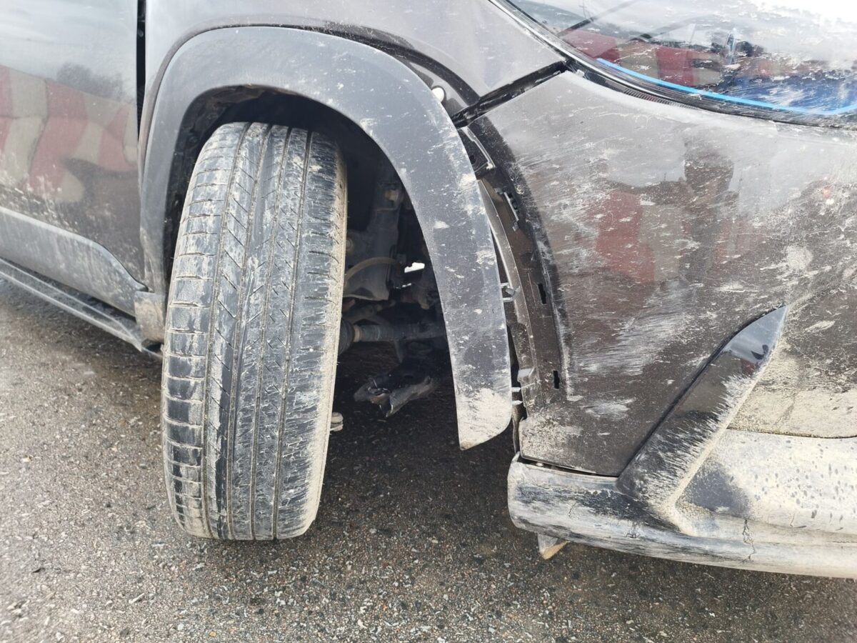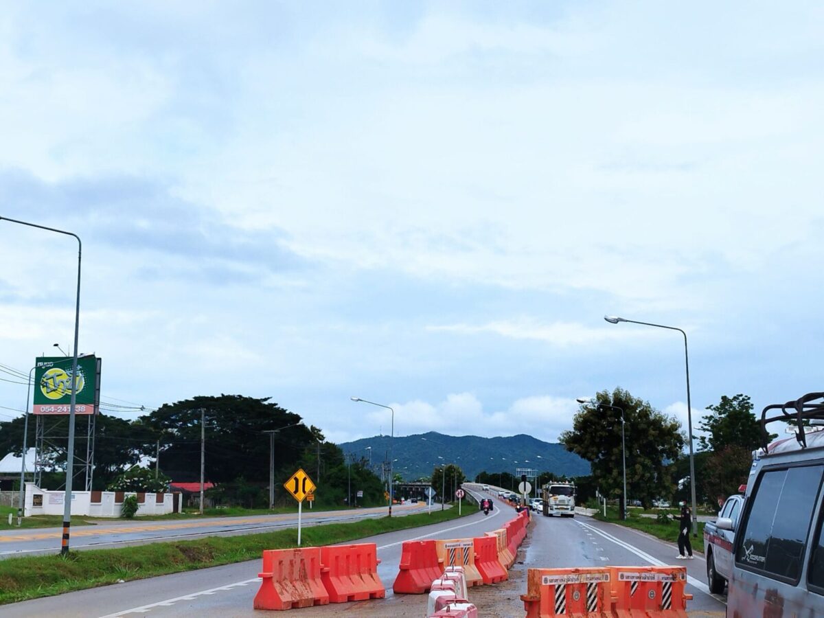 โดยในที่เกิดเหตุเป็นช่วงขาลงทางยกระดับ ที่มีการบีบช่องจราจรให้เหลือ 2 ช่องทาง จากปกติที่มี 4 ช่องทาง ทำให้มีการนำแบริเออร์ เสาล้มลุก หรือเสาอ่อน มาแบ่งช่องจราจร เพื่อให้ใช้ความระมัดระวัง พบรถยนต์โตโยต้า ครอส สีเทา หมายเลขทะเบียนจังหวัดพิษณุโลก จอดในสภาพล้อรถด้านหน้าขวาพังเสียหายจนลูกหมากหลุดออกจากล้อรถ ไม่สามารถขับเคลื่อนได้ มีเศษทรายกระจายเปรอะเปื้อนเต็มหน้ารถ และระบบความปลอดภัยในรถทำงานทั้งหมด โดยมีผู้โดยสารมากับรถทั้งหมด 4 คน เป็นครอบครัว พ่อแม่และลูกชาย อายุระหว่าง 6-8 ขวบ 2 คน ซึ่งชายคนขับรถได้รับบาดเจ็บจุกเสียด และเจ็บที่ขาซ้าย ส่วนลูกชายทั้ง 2 คน ร้องไห้ด้วยความตกใจ เจ้าหน้าที่กู้ภัยจึงปฐมพยาบาลก่อนนำตัวส่งไปรักษา