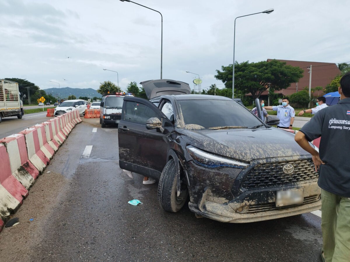 ด้านชาวบ้านที่เห็นเหตุการณ์ เล่าว่า รถยนต์กระบะสีดำ ได้ขับมุ่งหน้าไปทางสะพานยกระดับ ส่วนรถเก๋งได้ขับสวนทางมามุ่งหน้าไป จ.เชียงใหม่ ขณะนั้นรถกระบะได้ขับชนกับถังสีฟ้าที่ใช้กั้นถนน จนถังกระเด็นไปฟาดใส่รถเก๋งที่สวนมาอย่างแรง จนลูกหมากล้อรถหลุดและแรงกระแทกทำให้คนในรถเก๋งได้รับบาดเจ็บ ส่วนถังได้กระเด็นไปอยู่ไหล่ทางฝั่งตรงข้าม