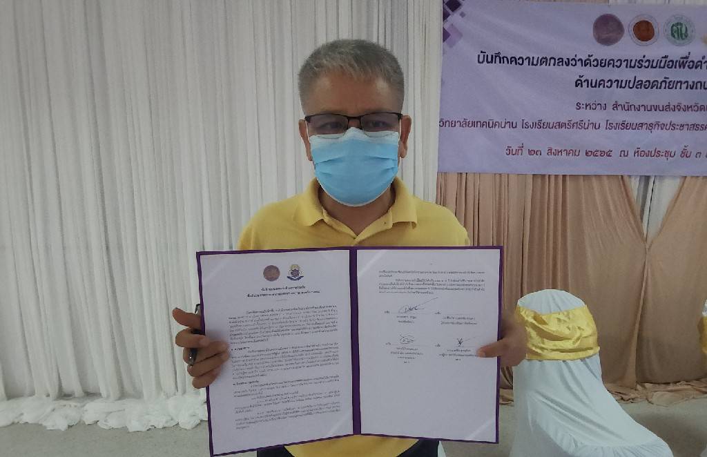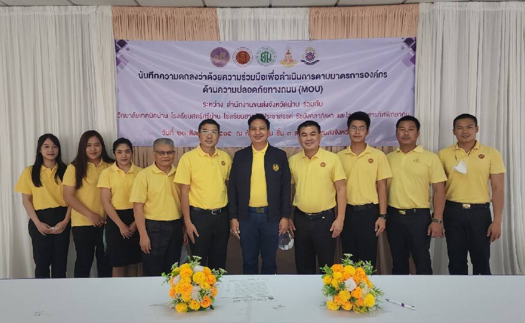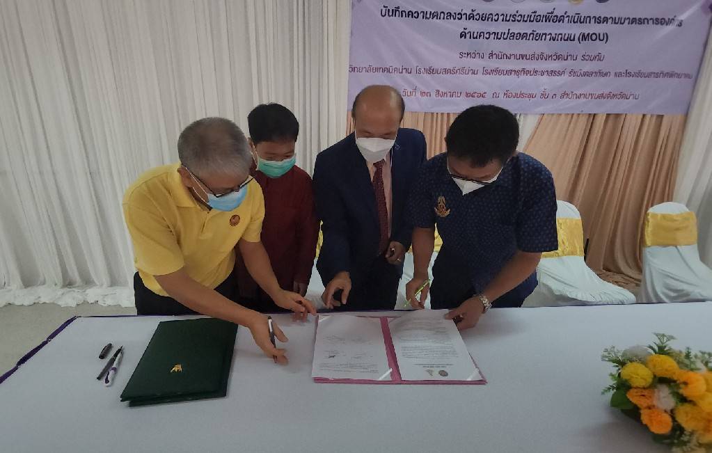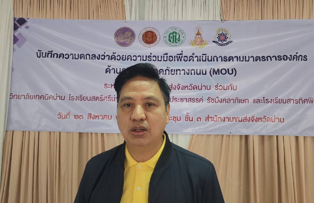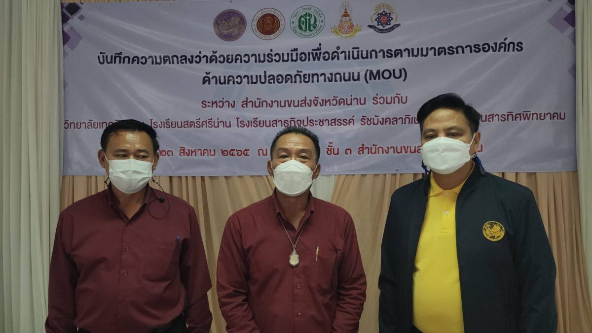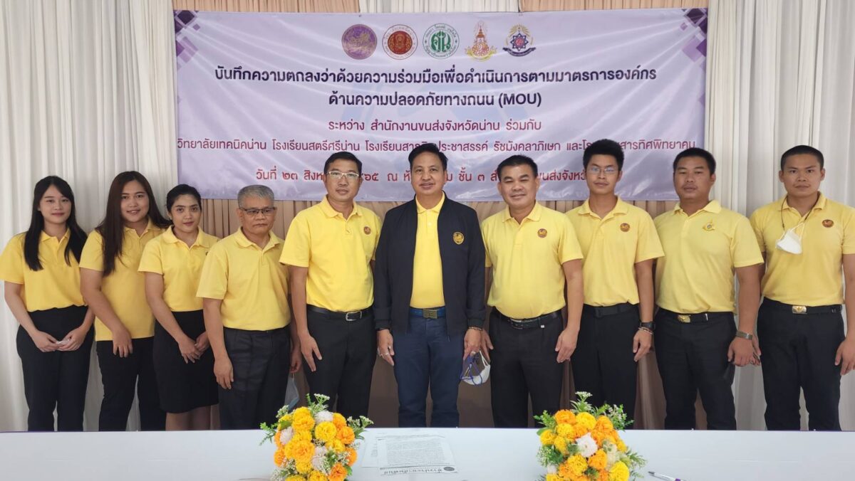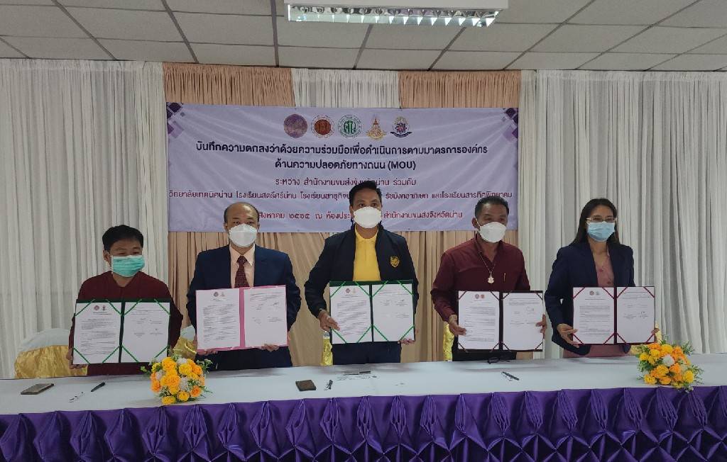 เมื่อวันที่ 23 สิงหาคม 2565 ณ ห้องประชุม ชั้น 3 สำนักงานขนส่งจังหวัดน่าน นายสหชาติ คำพูน ขนส่งจังหวัดน่าน เปิดเผยว่า ตามที่กรมการขนส่งทางบกได้ออกประกาศ เรื่อง มาตรการองค์กรด้านความปลอดภัยทางถนน ลงวันที่ 31 มกราคม 2565 โดยกำหนดให้บุคลากรกรมการขนส่งทางบกปฏิบัติตามกฎจราจร กฎหมายและกฎระเบียบที่เกี่ยวข้องอย่างเคร่งครัดในวิถีชีวิตประจำวัน เพื่อสร้างภาพลักษณ์และเป็นแบบอย่างที่ดีแก่บุคคลทั่วไป รวมถึงกำหนดให้พื้นที่ในการกำกับดูแลเป็นเขตควบคุมวินัยจราจร เพื่อเป็นการปลูกฝังจิตสำนึกด้านความปลอดภัยทางถนน และการสร้างความตระหนักรู้ในการรักษาวินัยจราจรแก่ผู้ใช้รถใช้ถนน จึงได้ขยายการดำเนินมาตรการองค์กรด้านความปลอดภัยทางถนนไปยังภาคีเครือข่ายทั้งภาครัฐและภาคเอกชน โดยจัดทำบันทึกความตกลงว่าด้วยความร่วมมือเพื่อดำเนินการตามมาตรการองค์กร ด้านความปลอดภัยทางถนน (MOU) ร่วมกับโรงเรียนที่เข้าร่วมกิจกรรมโครงการนักเรียนรุ่นใหม่มีใบขับขี่ โดยในครั้งนี้สำนักงานขนส่งจังหวัดน่านได้จัดทำบันทึกความตกลงร่วมกับ วิทยาลัยเทคนิคน่าน โรงเรียนสตรีศรีน่าน โรงเรียนสาธุกิจประชาสรรค์ รัชมังคลาภิเษก และโรงเรียนสารทิศพิทยาคม