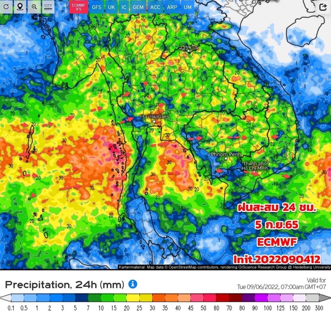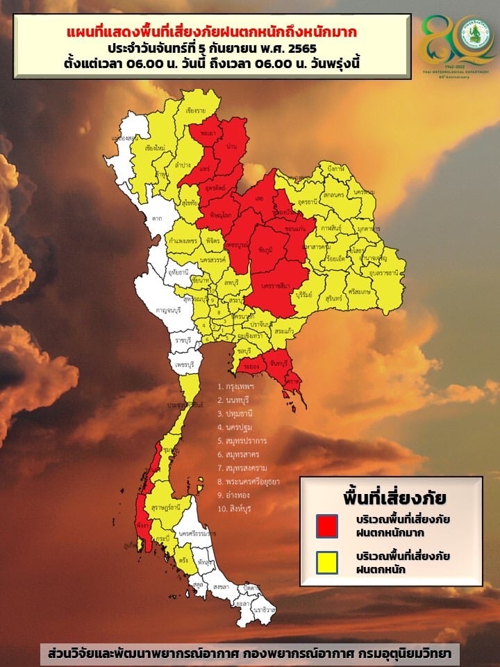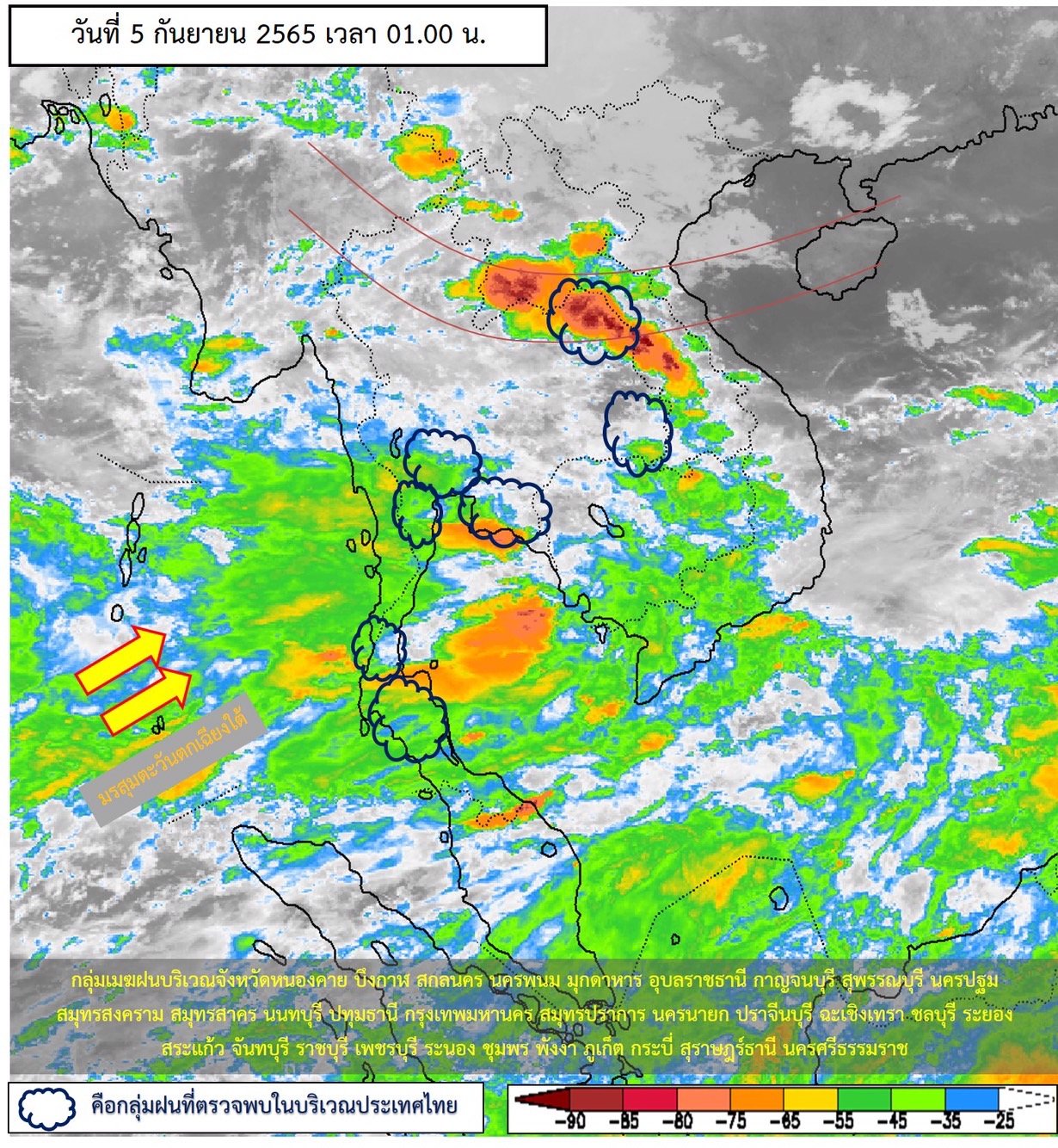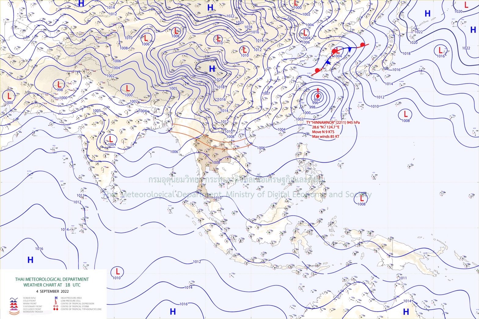 อนึ่ง ในช่วงวันที่ 6-9 ก.ย. 65 ร่องมรสุมกำลังแรงจะเลื่อนลงมาพาดผ่านภาคเหนือตอนล่าง ภาคกลางตอนบน และภาคตะวันออกเฉียงเหนือ ประกอบกับมรสุมตะวันตกเฉียงใต้ที่พัดปกคลุมทะเลอันดามัน ภาคใต้ และอ่าวไทย มีกำลังค่อนข้างแรง ลักษณะเช่นนี้ทำให้ประเทศไทยมีฝนเพิ่มขึ้นและมีฝนตกหนักถึงหนักมากบางแห่ง สำหรับคลื่นลมบริเวณทะเลอันดามันตอนบนและอ่าวไทยตอนบนมีกำลังค่อนข้างแรง โดยมีคลื่นสูง 2-3 เมตร บริเวณที่มีฝนฟ้าคะนองคลื่นสูงมากกว่า 3 เมตร
