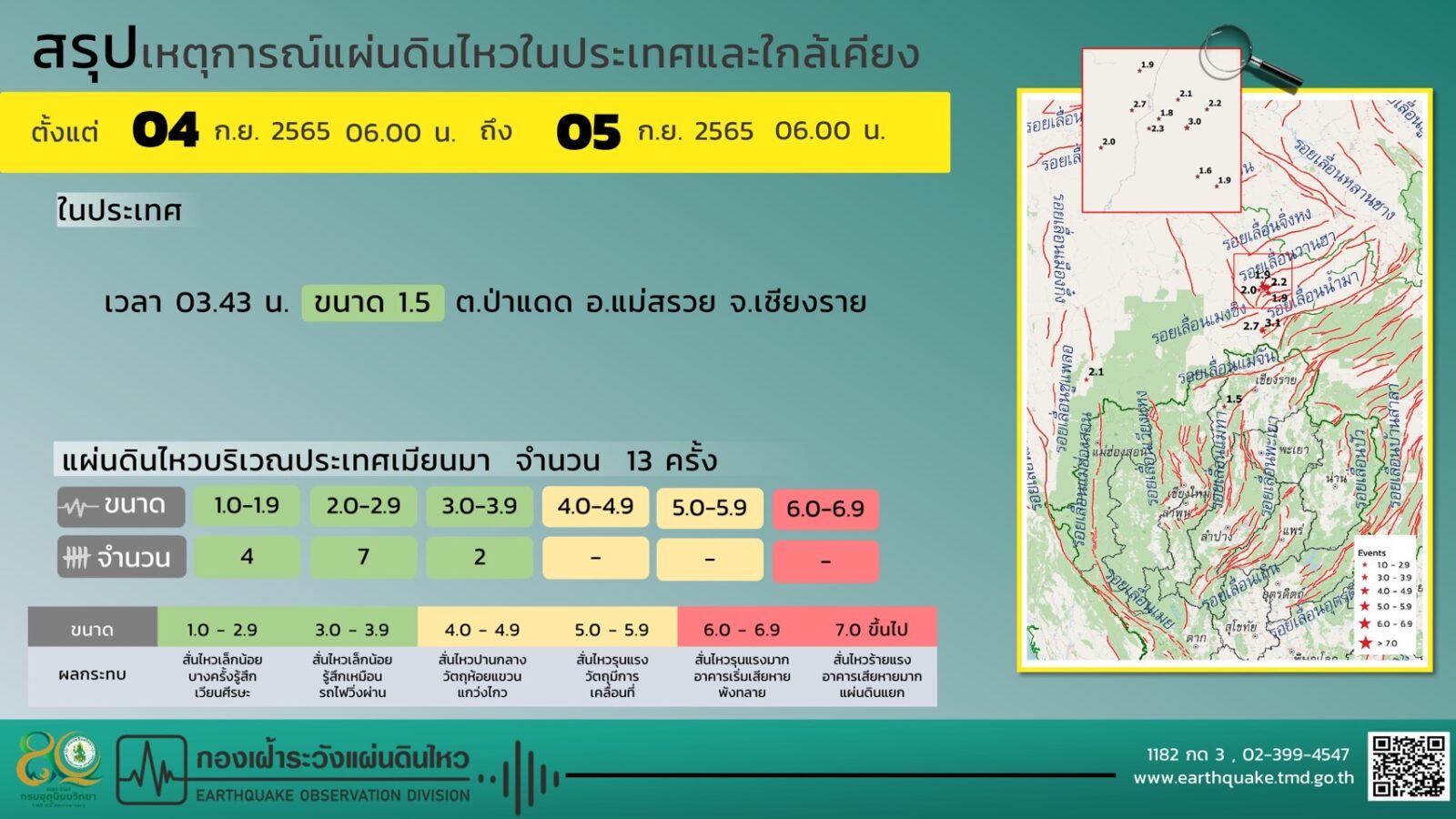 สำหรับสถานการณ์แผ่นดินไหวในช่วงวันที่ 4-5 กันยายน 2565 ตรวจพบเหตุการณ์แผ่นดินไหว ขนาด 1.6-3.1 จำนวน 13 ครั้ง มีศูนย์กลางอยู่ที่ประเทศเมียนมา และขนาด 1.5 มีศูนย์กลางอยู่ที่ ต.ป่าแดด อ.แม่สรวย จ.เชียงราย ซึ่งเป็นแผ่นดินไหวขนาดเล็ก ไม่มีผลกระทบต่อประเทศไทยแต่อย่างใด