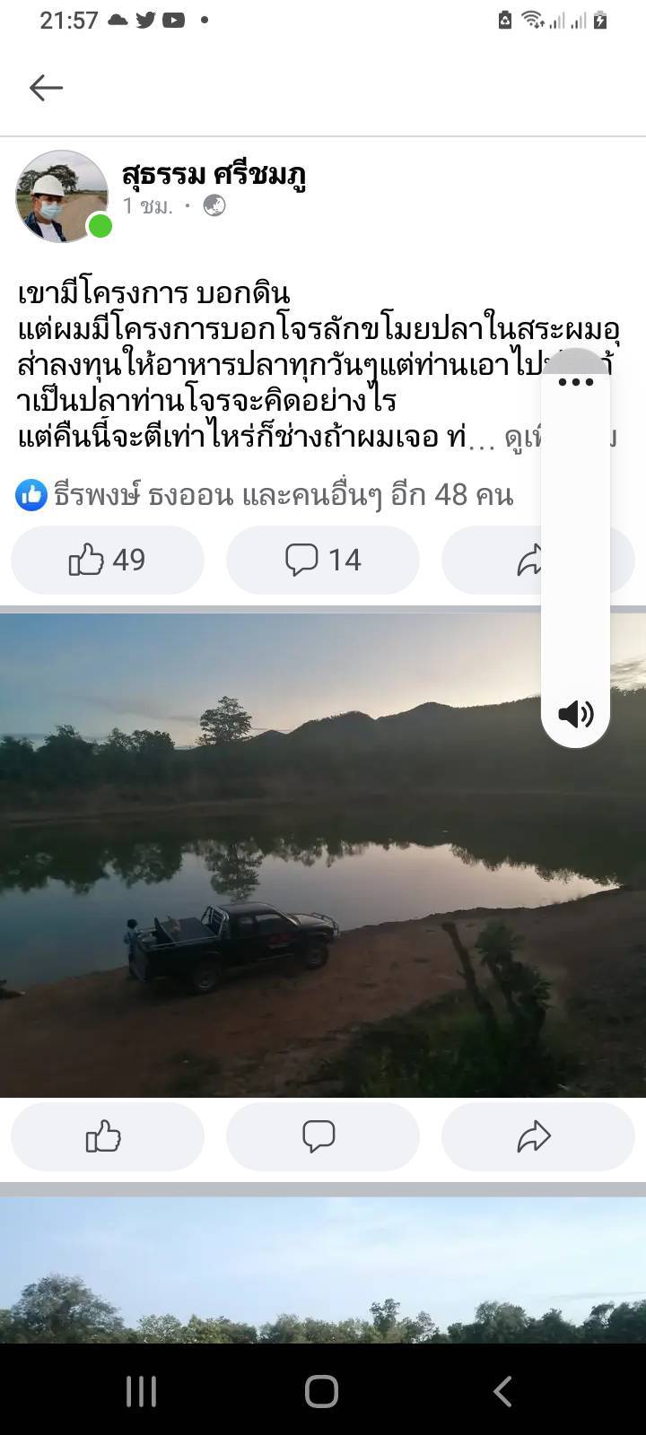 พฤติกรรมของคนร้ายที่เข้ามาลักปลาก็เข้ามาในช่วง ตีสอง ตีสาม ตนเคยจับคนร้ายมาแล้วครั้งหนี่ง นำไปพูดคุยกันที่บ้านผู้ใหญ่บ้าน ส่วนคนร้ายรายนี้ที่เข้ามาลัก คาดว่า สองสามวันที่ผ่านมา ซึ่งเป็นช่วงที่ตนยุ่งช่วยชาวบ้าน จึงไม่มีเวลามาจับคนร้ายรายนี้ ปลาที่นำมาเลี้ยงลงทุนซื้อมาครั้ง 5-6 พันบาท ตั้งใจหากปลาโตแล้วจะจับไปแจกให้ชาวบ้านครอบครัวละ 10ตัวนำไปเลี้ยง พร้อมกับสอนวิธีเลี้ยง การให้อาหาร โครงการแจกปลาให้ชาวบ้านมีอันต้องพับไป และตนจะติดกล้องวงจรปิด ขอเตือนอีกครั้งพวกที่มาลักปลาให้เลิกการกระทำเสียอย่างเด็ดขาด หากเจอโดนโทษหนักจะให้ตำรวจดำเนินคดีไม่มีการออมชอมอย่างเด็ดขาด ถือว่าเตือนแล้ว