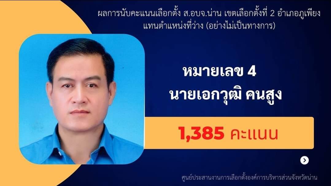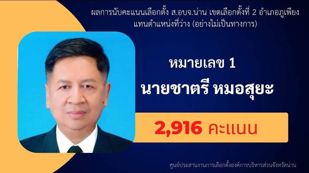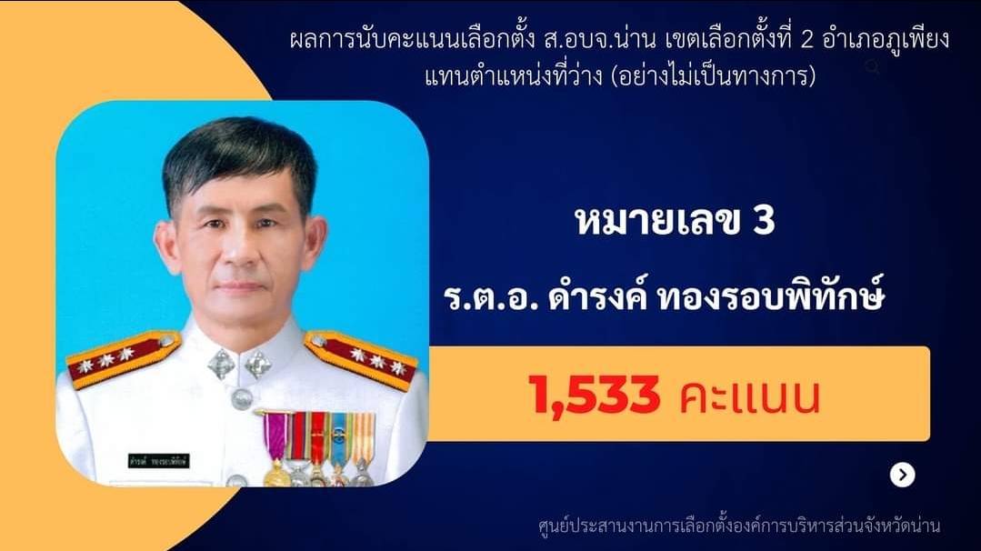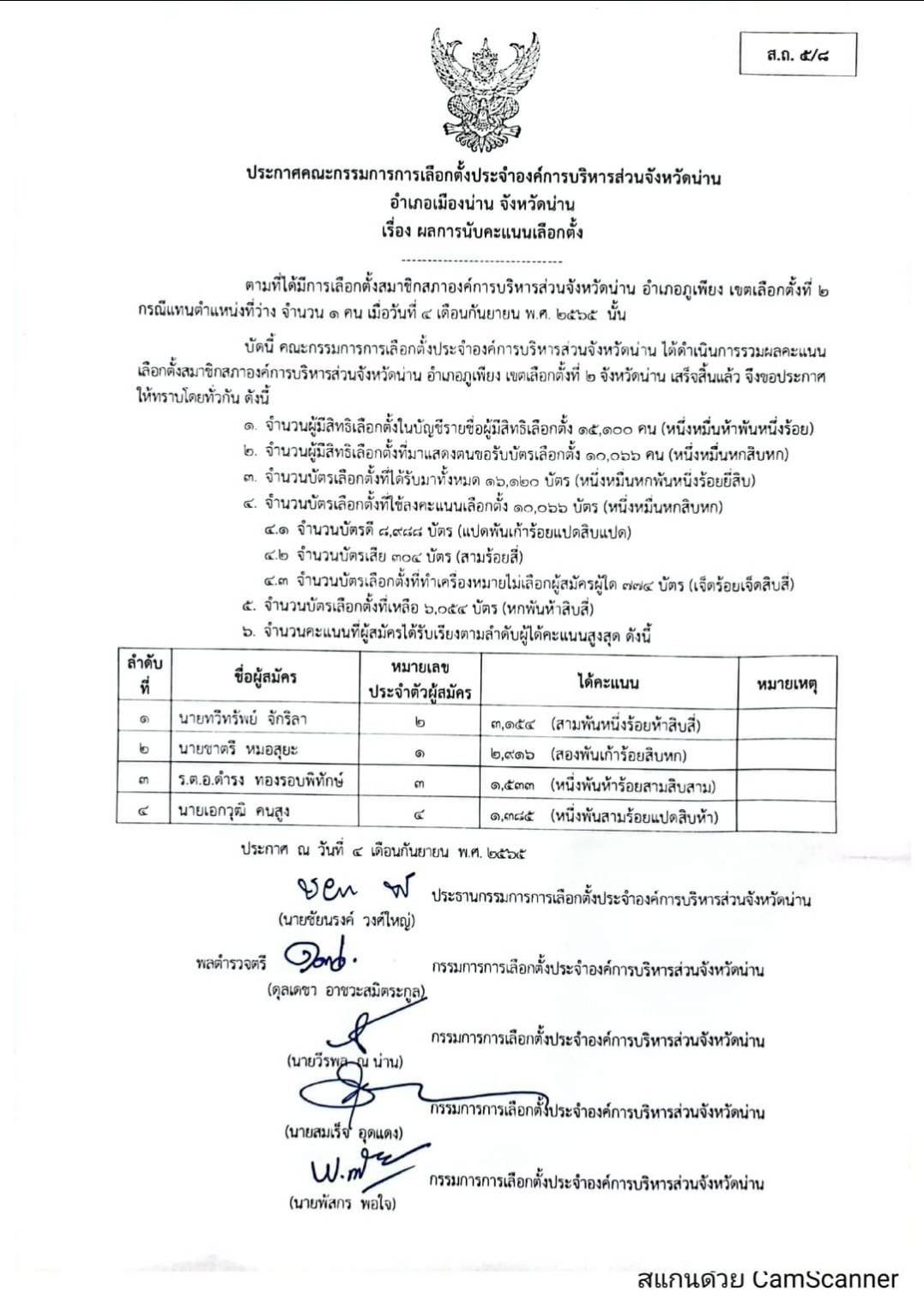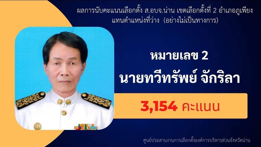 ผลคะแนน เลือกตั้ง ส.อบจ.น่าน เขตเลือกตั้งที่ 2 อำเภอภูเพียง แทนตำแหน่งที่ว่าง ผลการนับคะแนนอย่างทางการ ได้แก่ หมายเลข 2 นายทวีทรัพย์ จักริลา ได้คะแนน 3,154