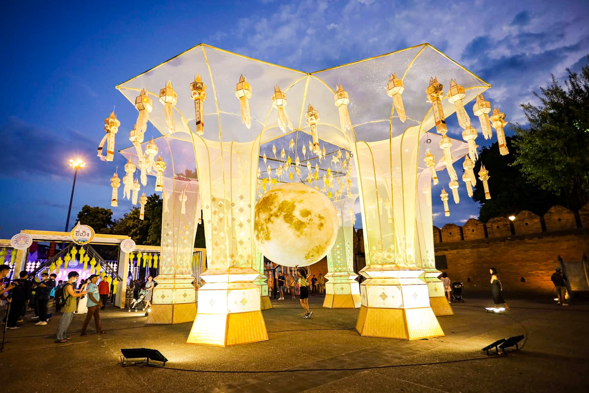 บรรยากาศที่บริเวณข่วงประตูท่าแพ อำเภอเมือง จังหวัดเชียงใหม่ ค่ำคืนที่ผ่านมาถูกตกแต่งประดับประดาด้วยโคมล้านนาหลากหลายสีสันนับหมื่นดวง เต็มพื้นที่ แสงศิลป์ประทีปเบิกฟ้ายี่เป็งเชียงใหม่ ในงานเทศกาลยี่เป็ง หรือ ลอยกระทง จะมีขึ้นในระหว่างวันที่ 7 – 9 พฤศจิกายน 65 มีกิจกรรมทางวัฒนธรรมอีกมากมาย โดยเฉพาะพระจันทร์ดวงใหญ่ ที่สื่อถึงความหมายค่ำคืนเดือนยี่เป็ง ในภาษาล้านนา ภาษากลาง ก็คือ วันเพ็ญ นักท่องเที่ยวทั้งชาวไทยและชาวต่างชาติ ที่ตั้งใจเดินทางมาร่วมงานเทศกาลยี่เป็ง ก็พากันถ่ายรูปเป็นที่ระลึกจำนวนมาก