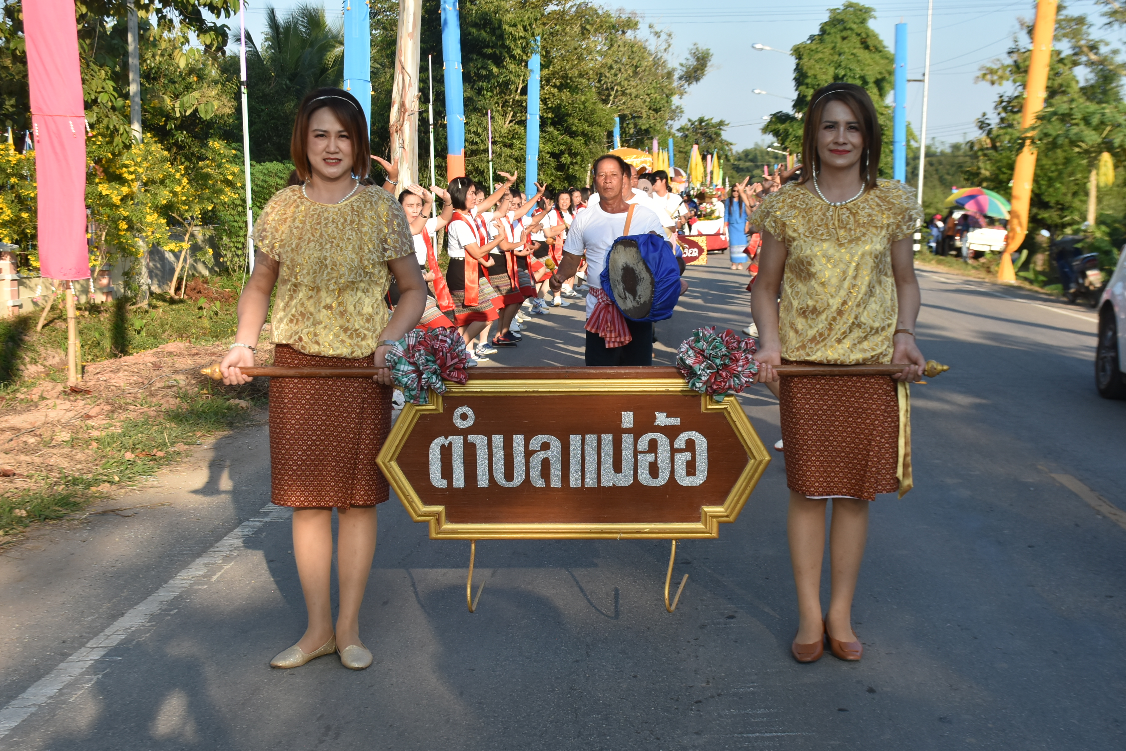 งานประเพณีลอยกระทงของ อบต.แม่อ้อ ในปีนี้ ได้เริ่มต้นงานโดยการเดินขบวนแห่ ซึ่งเป็นขบวนของวัดและโรงเรียนต่างๆในพื้นที่ ซึ่งต่างก็ประดับประดารถแห่ได้อย่างสวยงาม โดยเริ่มตั้งขบวนและเดินมาจากโรงเรียนแม่อ้อประชารัฐ ซึ่งอยู่ห่างจาก อบต.แม่อ้อ ประมาณ 1 กม. และในงานปีนี้ยังมีจุดเด่นตามแบบงานวัดในอดีต เช่น มีการชกมวย หนังกลางแปลง รำวงย้อนยุค และมีโดมกระทงอาเซียน ไว้ให้นักท่องเที่ยวได้ชื่นชมความยิ่งใหญ่ของประเพณีงานลอยกระทง ซึ่งถือว่าเป็นการจัดงานลอยกระทงในพื้นที่ ต.แม่อ้อ เป็นครั้งแรกในรอบ 30 ปี นับตั้งแต่มีการก่อตั้ง อบต. ขึ้นมา