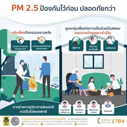 หมอกควันและฝุ่นละอองขนาดเล็ก PM2.5 เป็นปัญหาที่มักเกิดในช่วงฤดูหนาวต่อเนื่องช่วงฤดูร้อน เนื่องจากสภาพอกาศหนาวเย็น แห้งแล้ง สภาพภูมิประเทศที่เป็นแอ่งกระทะ การเผาวัชพืชและตอซังข้าว รวมถึงมลพิษจากแหล่งกำเนิด เช่น รถยนต์ควันดำ โรงงานอุตสาหกรรม เป็นต้น ทำให้สถานการณ์หมอกควันและฝุ่นละออง PM2.5 ทวีความรุนแรงมากขึ้น ส่งผลกระทบต่อสิ่งแวดล้อม เป็นอันตรายต่อสุขภาพ และเพิ่มความเสี่ยงต่อการเกิดอุบัติเหตุ เพื่อความปลอดภัย กรมป้องกันและบรรเทาสาธารณภัย (ปภ.) ขอแนะข้อควรปฏิบัติเพื่อป้องกันและลดผลกระทบจากปัญหาหมอกควันและฝุ่นละออง ดังนี้