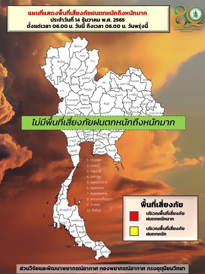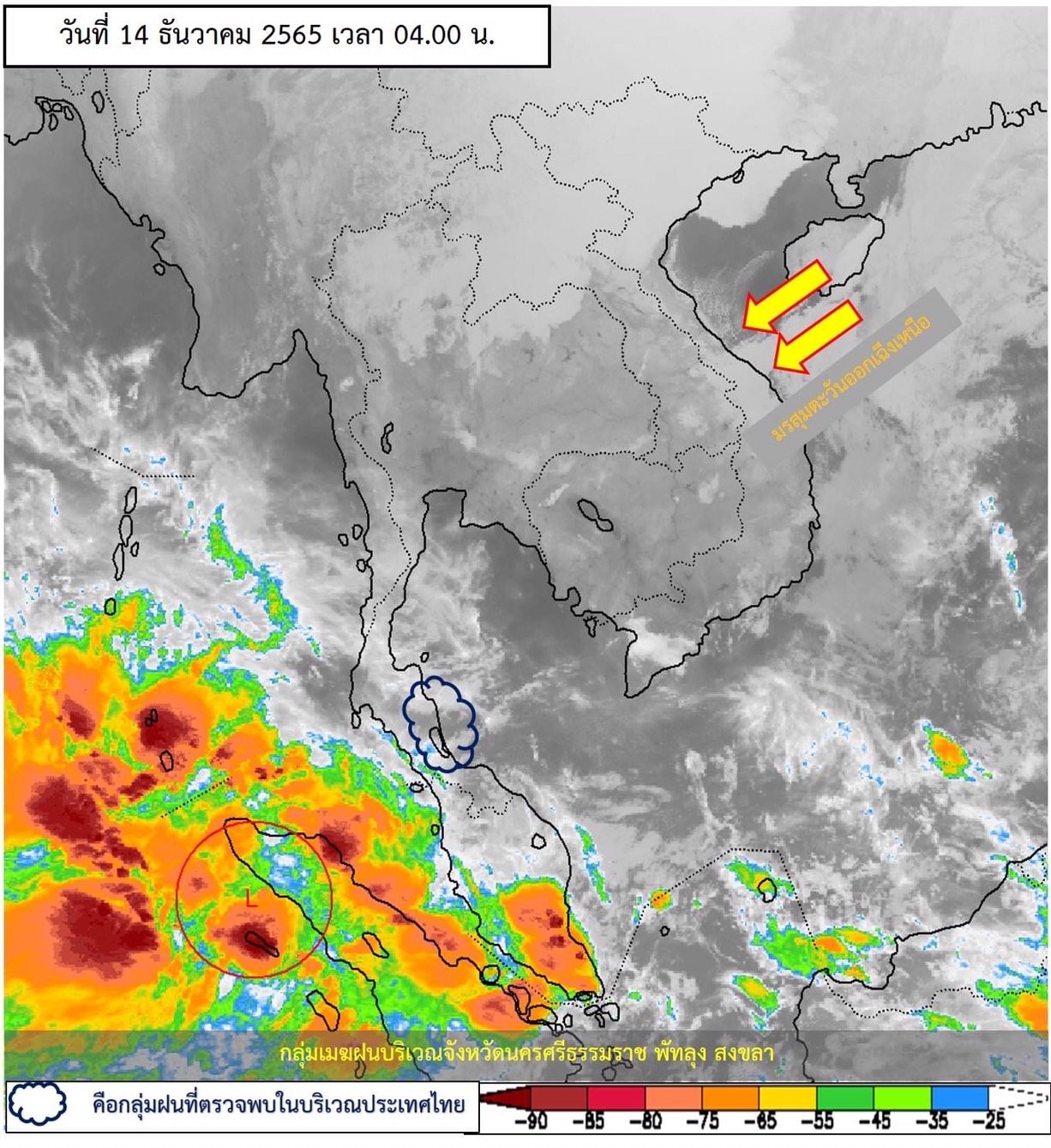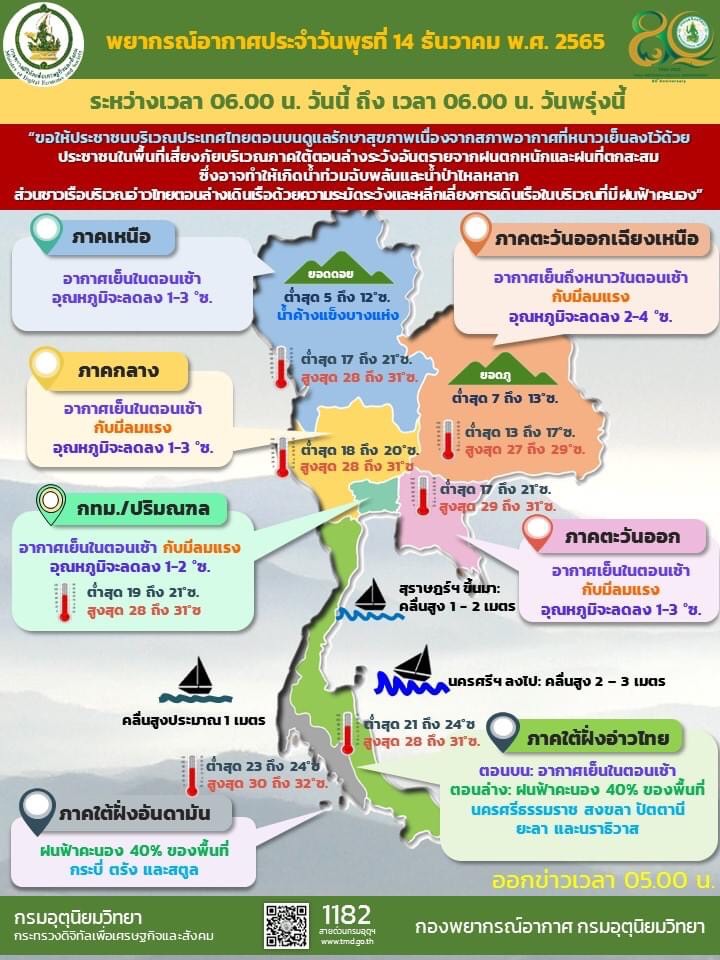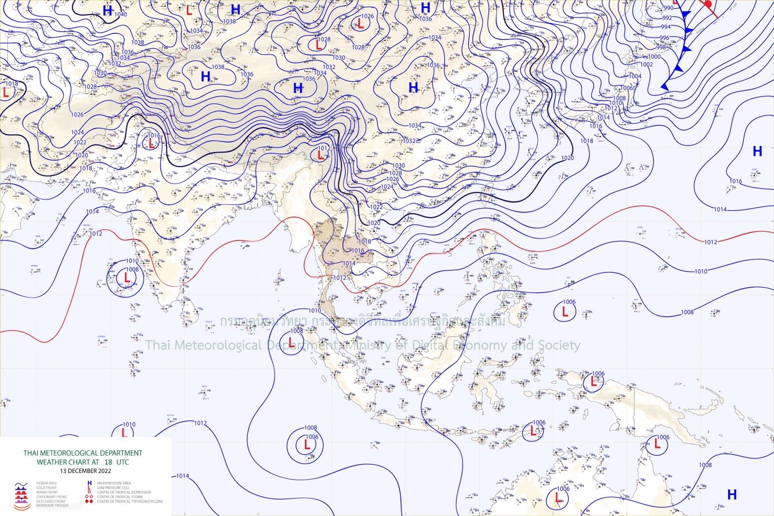 ลักษณะอากาศทั่วไป พยากรณ์อากาศ 24 ชั่วโมงข้างหน้า บริเวณความกดอากาศสูงหรือมวลอากาศเย็นกำลังค่อนข้างแรง จากประเทศจีนแผ่ปกคลุมประเทศไทยตอนบน ทำให้บริเวณดังกล่าวมีอากาศเย็นถึงหนาว อุณภูมิจะลดลงกับมีลมแรง โดยอุณหภูมิจะลดลง 2-4 องศาเซลเซียส ในภาคตะวันออกเฉียงเหนือ ส่วนภาคเหนือ ภาคกลางรวมทั้งกรุงเทพมหานครและปริมณฑล และภาคตะวันออก อุณหภูมิจะลดลง 1-3 องศาเซลเซียส ขอให้ประชาชนบริเวณประเทศไทยตอนบน ดูแลรักษาสุขภาพเนื่องจากสภาพอากาศที่หนาวเย็นลงไว้ด้วย