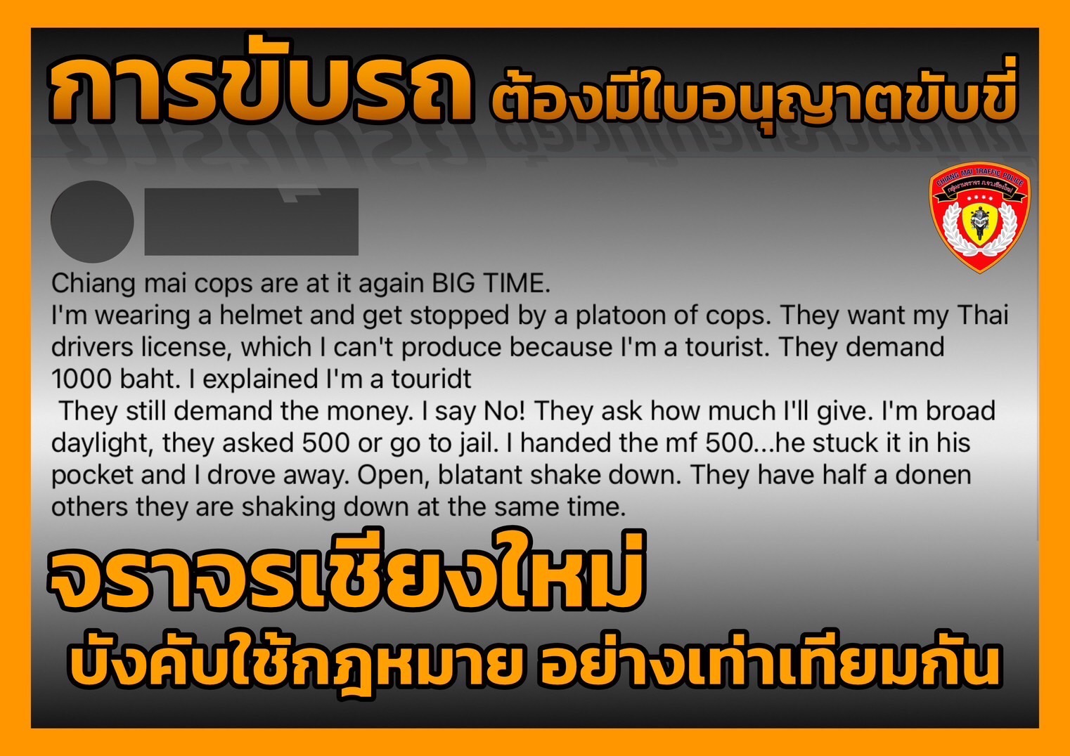 หากพบมีกรณีของเจ้าหน้าที่จราจร มีเรียกรับประโยชน์โดยทุจริตโดยที่ไม่ได้ดำเนินการ ตามขั้นตอนระเบียบและกฎหมาย สามารถร้องเรียนได้ที่เพจเฟสบุ๊ค กลุ่มงานจราจรตำรวจภูธรจังหวัดเชียงใหม่ หรือเบอร์โทร 053-235595 ก็จะให้มีการดำเนินการตรวจสอบ และมีมาตรการลงโทษตามระเบียบต่อไป