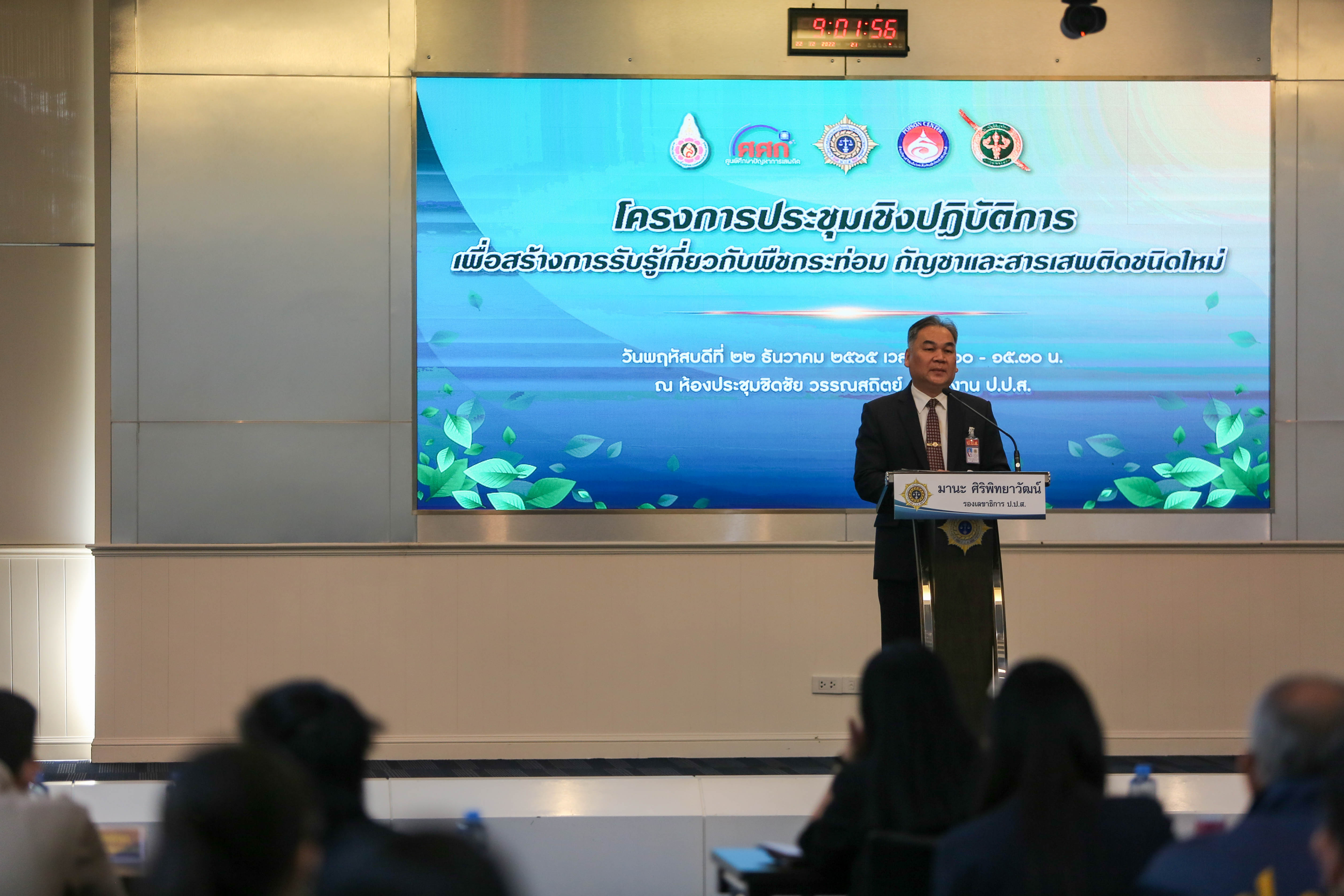 เมื่อวันที่ 22 ธันวาคม 2565 นายวิชัย ไชยมงคล เลขาธิการ ป.ป.ส. มอบหมาย นายมานะ ศิริพิทยาวัฒน์ รองเลขาธิการ ป.ป.ส. เป็นประธานการประชุมเชิงปฏิบัติการเพื่อการสร้างการรับรู้เกี่ยวกับพืชกระท่อม กัญชา และสารเสพติดชนิดใหม่ โดยมีวัตถุประสงค์ เพื่อสร้างการรับรู้เกี่ยวกับประโยชน์ โทษ และผลกระทบ ของพืชกระท่อม และพืชกัญชา รวมทั้งเพื่อให้รู้เท่าทันยาเสพติด/สารเสพติดชนิดใหม่ ณ สำนักงาน ป.ป.ส.