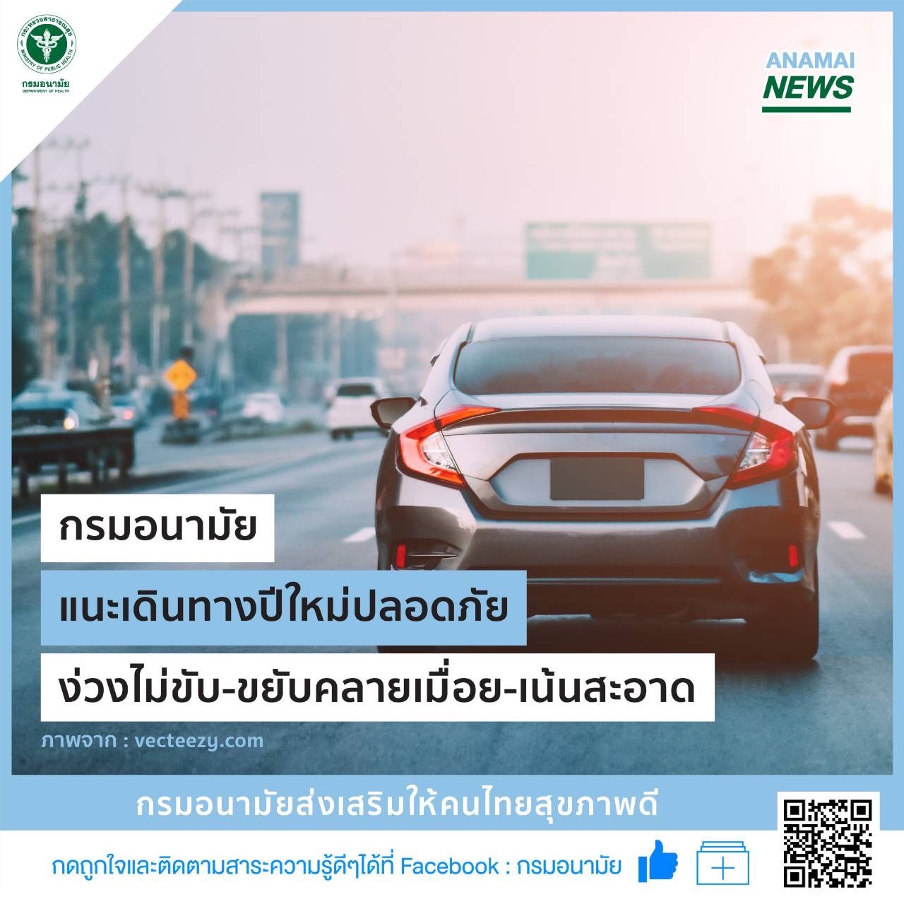 กรมอนามัย กระทรวงสาธารณสุข แนะประชาชนที่เดินทางไกล เพื่อท่องเที่ยวและกลับภูมิลำเนาในช่วงเทศกาลปีใหม่ ด้วยรถยนต์ส่วนตัว เตรียมตัวให้พร้อมเดินทางให้พร้อม ง่วงไม่ขับ ขยับเพื่อยืดเหยียดคลายความเมื่อย และเมื่อแวะตามสถานที่ต่างๆ ควรเลือกสถานที่สะอาด เพื่อความปลอดภัย