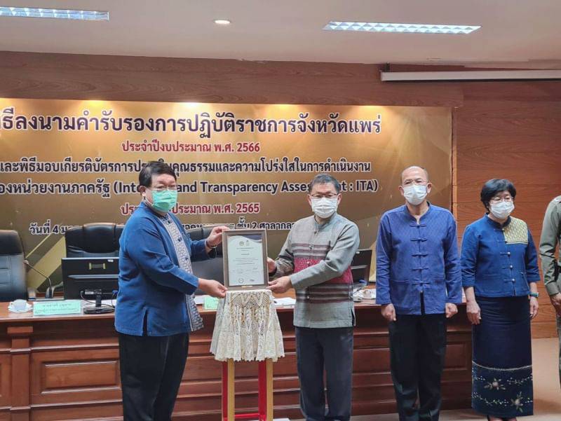 เมื่อบ่ายวันพุธที่ 4 มกราคม พ.ศ. 2566 เวลา 13.30 น. นายสัตวแพทย์ดร.สมพร พรวิเศษศิริกุล ปศุสัตว์จังหวัดแพร่ เข้าร่วมพิธีลงนามคำรับรองการปฏิบัติราชการจังหวัดแพร่ ประจำปีงบประมาณ พ.ศ.2566 และพิธีมอบเกียรติบัตรการประเมิณคุณธรรมและความโปร่งใสในการดำเนินงานภาครัฐ (Integrity and Transparency Assessment : ITA) ณ ห้องประชุมจดหมายเหตุ ชั้น 2 ศาลากลางจังหวัดแพร่ เพื่อใช้เป็นกรอบในการบริหารราชการของจังหวัด โดยมีเป้าหมายสำคัญเพื่อให้มีการบริหารราชการที่ธำรงรักษาไว้ซึ่งชาติ ศาสนา และพระมหากษัตริย์ รวมทั้งเป็นประโยชน์สุขของประชาชน โดยมี นายชุติเดช มีจันทร์ ผู้ว่าราชการจังหวัดแพร่ เป็นประธานการประชุม