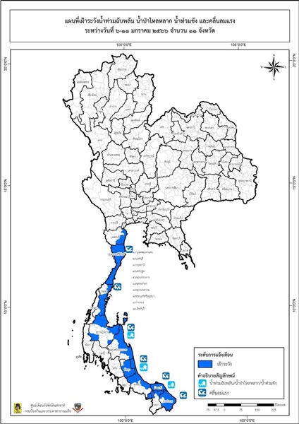 - พื้นที่เฝ้าระวังน้ำล้นตลิ่ง บริเวณแม่น้ำสายหลักและลำน้ำสาขาของแม่น้ำตาปี แม่น้ำปากพนัง แม่น้ำตรัง คลองชะอวด แม่น้ำสายบุรี แม่น้ำปัตตานี แม่น้ำบางนรา แม่น้ำโก-ลก และคลองตันหยงมัส