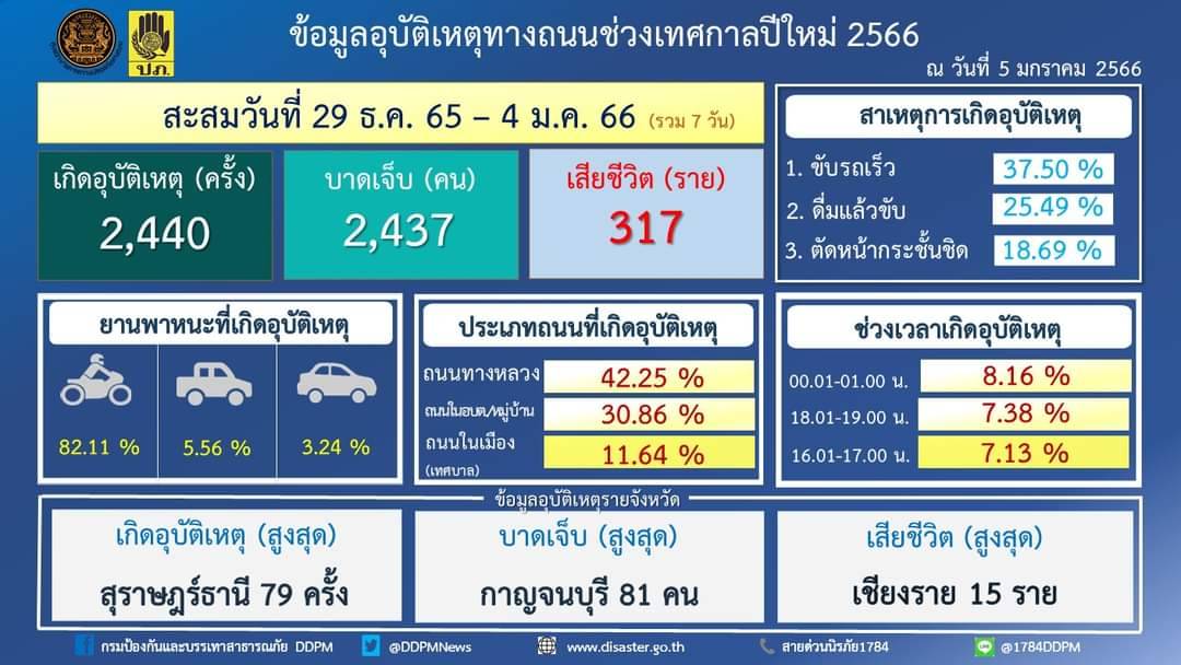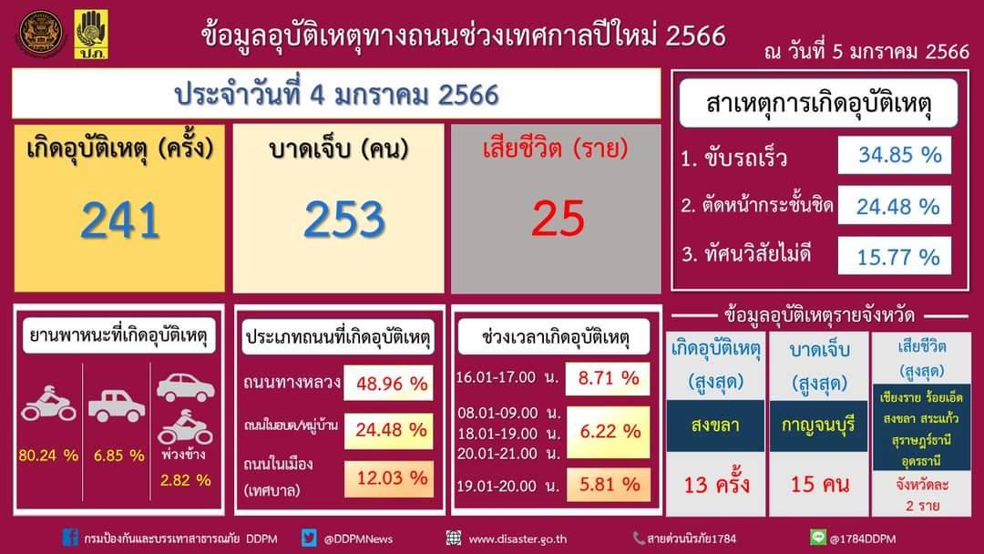 สรุปสถิติอุบัติเหตุทางถนนประจำวันที่ 4 มกราคม 2566