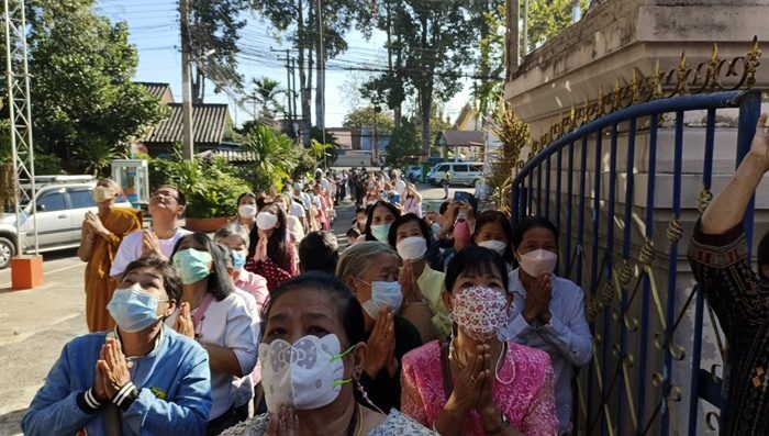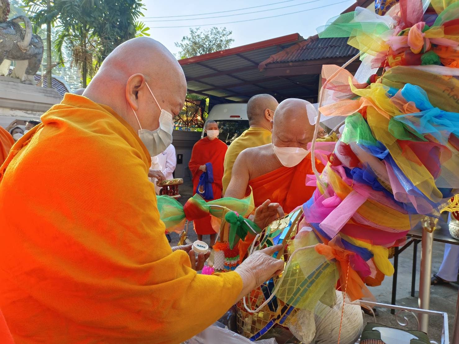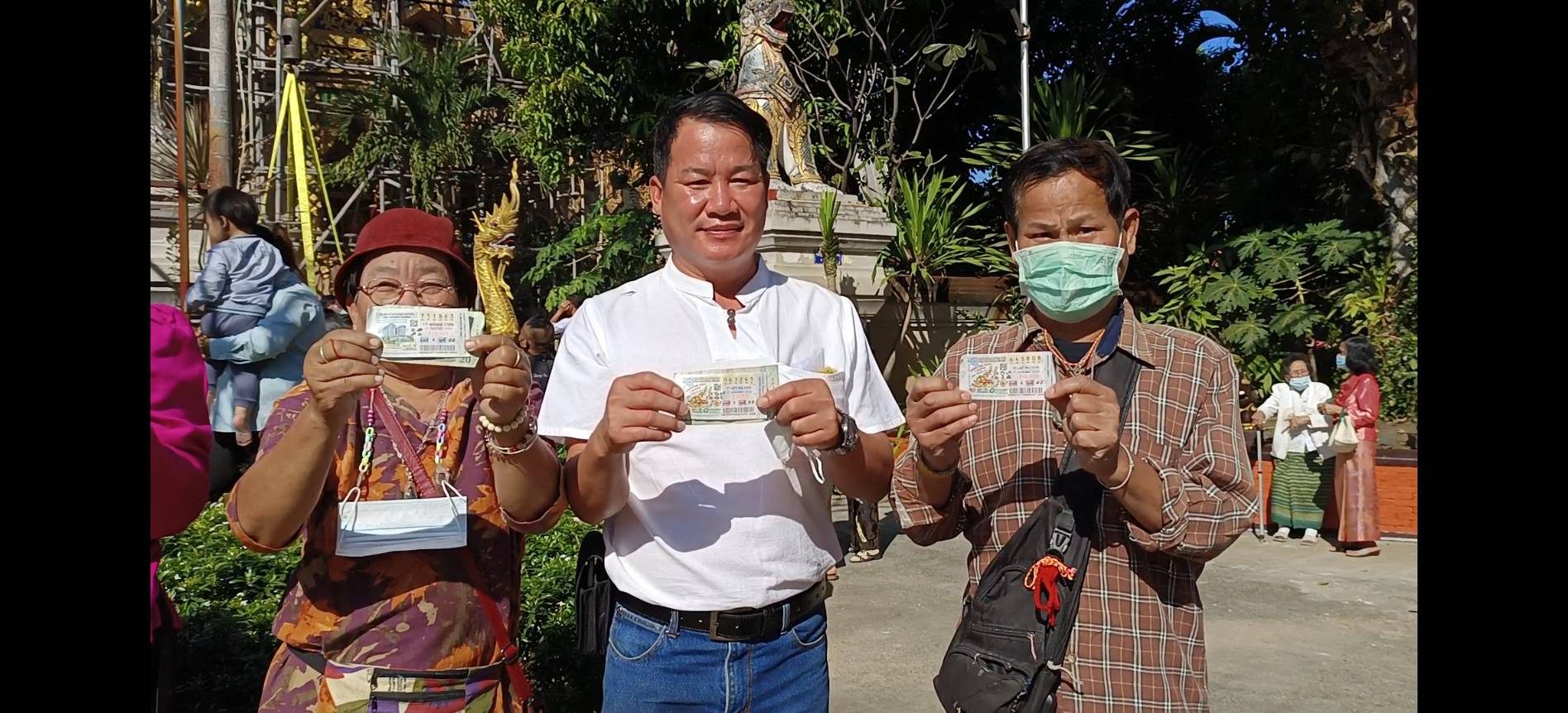 ซึ่งขณะยกช่อฟ้าและฉัตรขึ้นส่งบนหลังคาพระวิหารแล้ว ได้มีการโปรยทานโดยคณะกรรมการของทางวัดได้ขึ้นกระเช้ารถเครนทะเบียน 70-9898 ขึ้นโปรยทาน มีทั้งเงินแบงค์ 20 บาท แบงค์ 50 บาท แบงค์ 100 บาท รวม 1 หมื่นบาท แต่ที่ฮือฮา ก็จะมีการโปรยสลากกินแบ่งรัฐบาล งวดวันที่ 17 ม.ค.66 จำนวน 24 ใบปนมาด้วย คณะศรัทธาต่างห้อมล้อมแย่งรับเงิน และใบสลากกินแบ่งรัฐบาลกัน เพื่อเก็บไว้เป็นศิริมงคล ส่วนคนที่เก็บสลากได้ถ้าถูกสลากก็จะมาทำบุญกับวัดอีก ซึ่งจะมีงานบุญใหญ่ปอยหลวงฉลองพระวิหารในเดือนมีนาคม 2566 นี้อีกด้วย ส่วนยอดทำบุญยกฉัตรและช่อฟ้าได้เงินรวม 125,990 บาท
