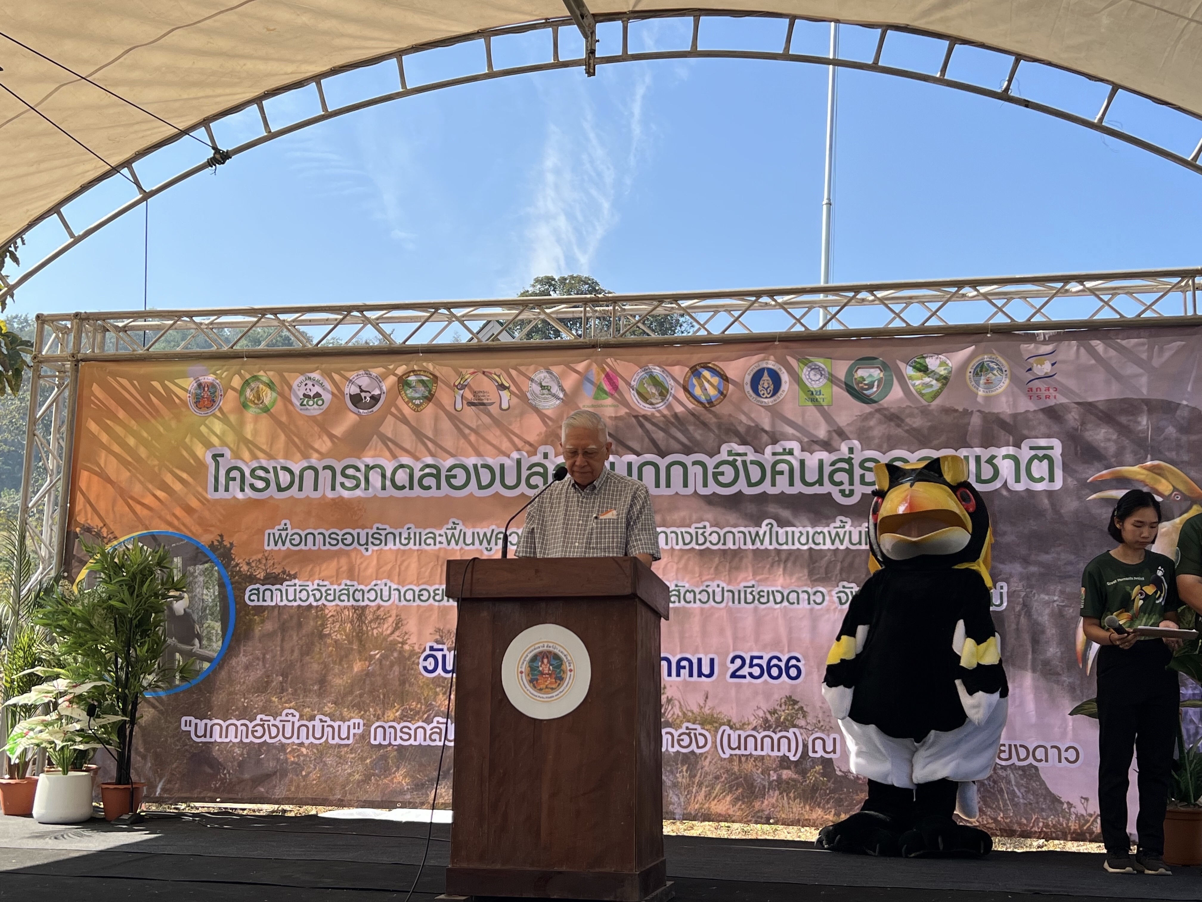 วันที่ 9 มกราคม 2566 ณ สถานีวิจัยสัตว์ป่าดอยเชียงดาว เขตรักษาพันธุ์สัตว์ป่าเชียงดาว จังหวัดเชียงใหม่ นายชัชวาลย์ ปัญญา รองผู้ว่าราชการจังหวัดเชียงใหม่ พร้อมด้วย นายอรรถพร ศรีเหรัญ ผู้อำนวยการองค์การสวนสัตว์แห่งประเทศไทย นายวุฒิชัยม่วงมัน ผู้อำนวยการสวนสัตว์เชียงใหม่ นายกฤตภาส ขันทะธงสกุลดี ผู้อำนวยการส่วนอนุรักษ์สัตว์ป่า สำนักบริหารพื้นที่อนุรักษ์ที่ 16 เชียงใหม่ นายสงัด บูรณภัทรโชติ นายอำเภอเชียงดาว นายณัฐกุล ขันทะสอน หัวหน้าเขตรักษาพันธุ์สัตว์ป่าเชียงดาว คณะผู้บริหารองค์การสวนสัตว์แห่งประเทศไทย ดร.วรพัฒน์ อรรถยุกติ ประธานมูลนิธิศึกษาวิจัยนกเงือก หัวหน้าอุทยานแห่งชาติ-เขตรักษาพันธุ์สัตว์ป่าในพื้นที่ภาคเหนือ องค์การบริหารส่วนท้องถิ่น หัวหน้าหน่วยงานภาครัฐ ผู้นำชุมชน ผู้นำโรงเรียน ตัวแทนชาวบ้านในจังหวัดเชียงใหม่ ร่วมกันเปิดโครงการ “การทดลองปล่อยนกกาฮังคืนสู่ธรรมชาติ เพื่อการอนุรักษ์และฟื้นฟูความหลากหลายทางชีวภาพในเขตพื้นที่ภาคเหนือ” ณ สถานีวิจัยสัตว์ป่าดอยเชียงดาว เขตรักษาพันธุ์สัตว์ป่าเชียงดาว จังหวัดเชียงใหม่ ภายใต้แนวคิด “นกกาฮังปิ๊กบ้าน” โดยการ นำนกกาฮังที่ได้รับการฟื้นฟูพฤติกรรมปล่อยคืนสู่ธรรมชาติในพื้นที่ป่าอนุรักษ์ของดอยหลวงเชียงดาว จังหวัดเชียงใหม่ ซึ่งเป็นอีกหนึ่งจุดเริ่มต้นของกระบวนการในการฟื้นฟูประชากรนกเงือกขนาดใหญ่ขึ้นใหม่อีกครั้ง ภายหลังการสูญพันธุ์ไปจากพื้นที่ป่าอนุรักษ์ภาคเหนือมานานนับ 20 ปี