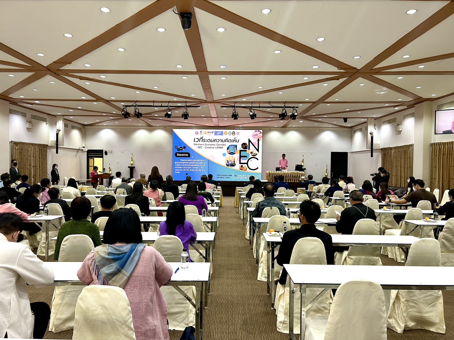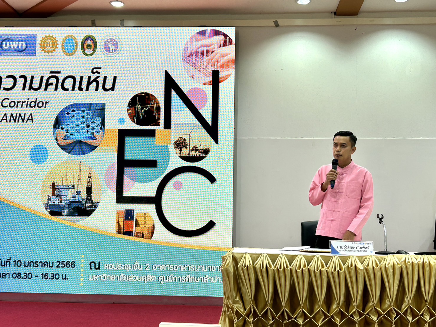วันที่ 10 มกราคม 2565 เวลา 09.00 น. ณ อาคารปฏิบัติการอาหารนานาชาติ มหาวิทยาลัยสวนดุสิต ศูนย์การศึกษาลำปาง นายชัชวาลย์ ฉายะบุตร ผู้ว่าราชการจังหวัดลำปาง มอบหมายให้ นายจำลักษ์ กันเพ็ชร์ รองผู้ว่าราชการจังหวัดลำปาง เป็นประธานในพิธีเปิดเวทีระดมความคิดเห็น เรื่อง “ยุทธศาสตร์การขับเคลื่อนลำปางสู่เศรษฐกิจสร้างสรรค์ ตามแนวนโยบายการพัฒนาระเบียงเศรษฐกิจพิเศษภาคเหนือ (Northern Economic Corridor : NEC – Creative LANNA) ด้วยฐานแนวคิด BCG Model”