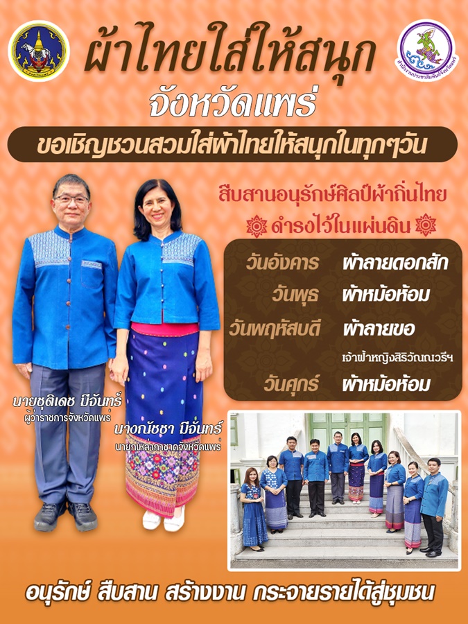 ผู้ว่าราชการจังหวัดแพร่ ขอเชิญชวน สวมใส่ผ้าไทย ทุกช่วงวัย ทุกโอกาส เพื่อส่งเสริมอัตลักษณ์ผ้าไทย และผ้าหม้อห้อมพื้นเมืองของจังหวัดแพร่สู่สากล และสนับสนุนหัตถกรรม ภูมิปัญญาท้องถิ่น ช่วยกระจายรายได้ไปสู่ชุมชน