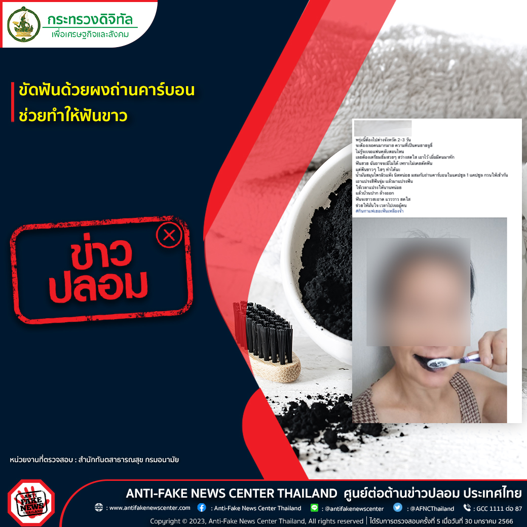ตามที่มีข้อมูลชวนเชื่อในประเด็นเรื่องขัดฟันด้วยผงถ่านคาร์บอน ช่วยทำให้ฟันขาว ทางศูนย์ต่อต้านข่าวปลอมได้ดำเนินการตรวจสอบข้อเท็จจริงกับสำนักทันตสาธารณสุข กรมอนามัย พบว่าประเด็นดังกล่าวนั้น เป็นข้อมูลเท็จ
