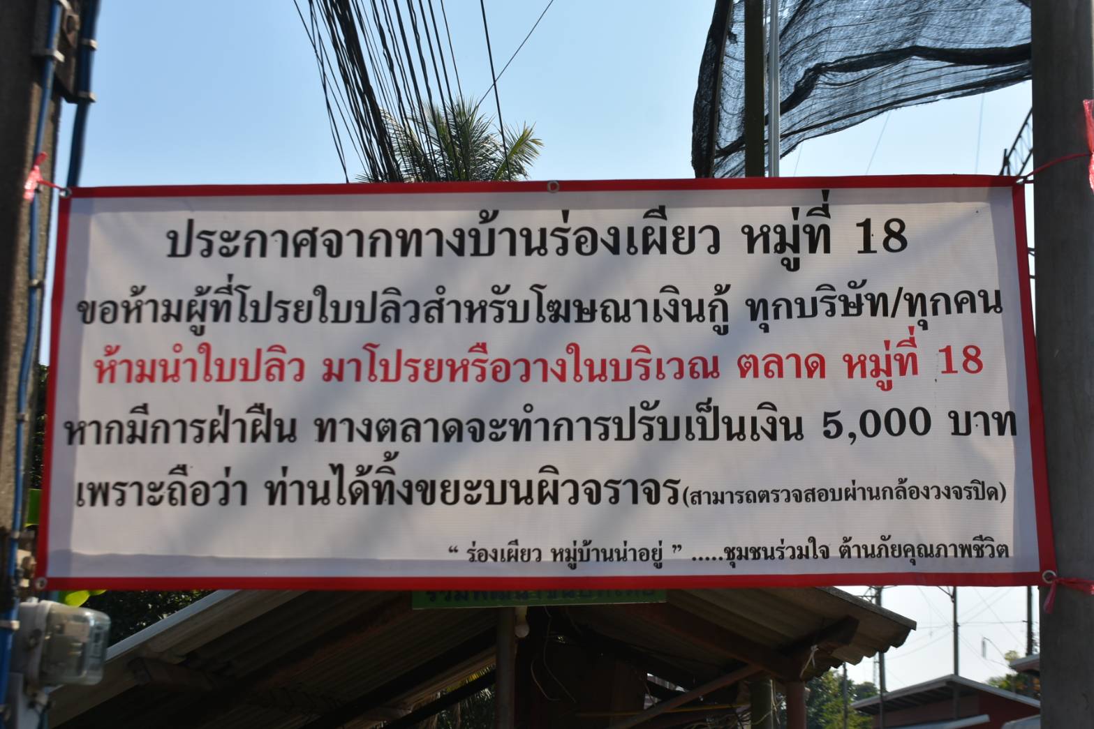“ทางชุมชนจึงได้ประชุมหารือร่วมกันเกี่ยวกับปัญหาดังกล่าว และเห็นชอบที่จะทำป้ายเตือนห้ามทิ้งนามบัตรดังกล่าว โดยเงินค่าปรับที่ได้จะนำมาเข้ากองกลางหมู่บ้านเพื่อจะนำมาใช้พัฒนาชุมชนต่อไป ซึ่งหลังจากได้ไปปรึกษากับเจ้าของร้านป้ายเขาก็เห็นด้วย จึงช่วยทำป้ายไวนีลมาติดที่ตลาดชุมชนของหมู่บ้าน จำนวน 3 ป้าย โดยหลังจากมีการติดป้ายไป ในช่วงแรกๆยังมีการมาโปรยอยู่ แต่ตอนนี้แทบจะไม่มีให้เห็นแล้ว หน้าบ่านสะอาดกว่าตอนก่อนติดป้ายเป็นอย่างมาก” นางแสงเดือน กล่าว