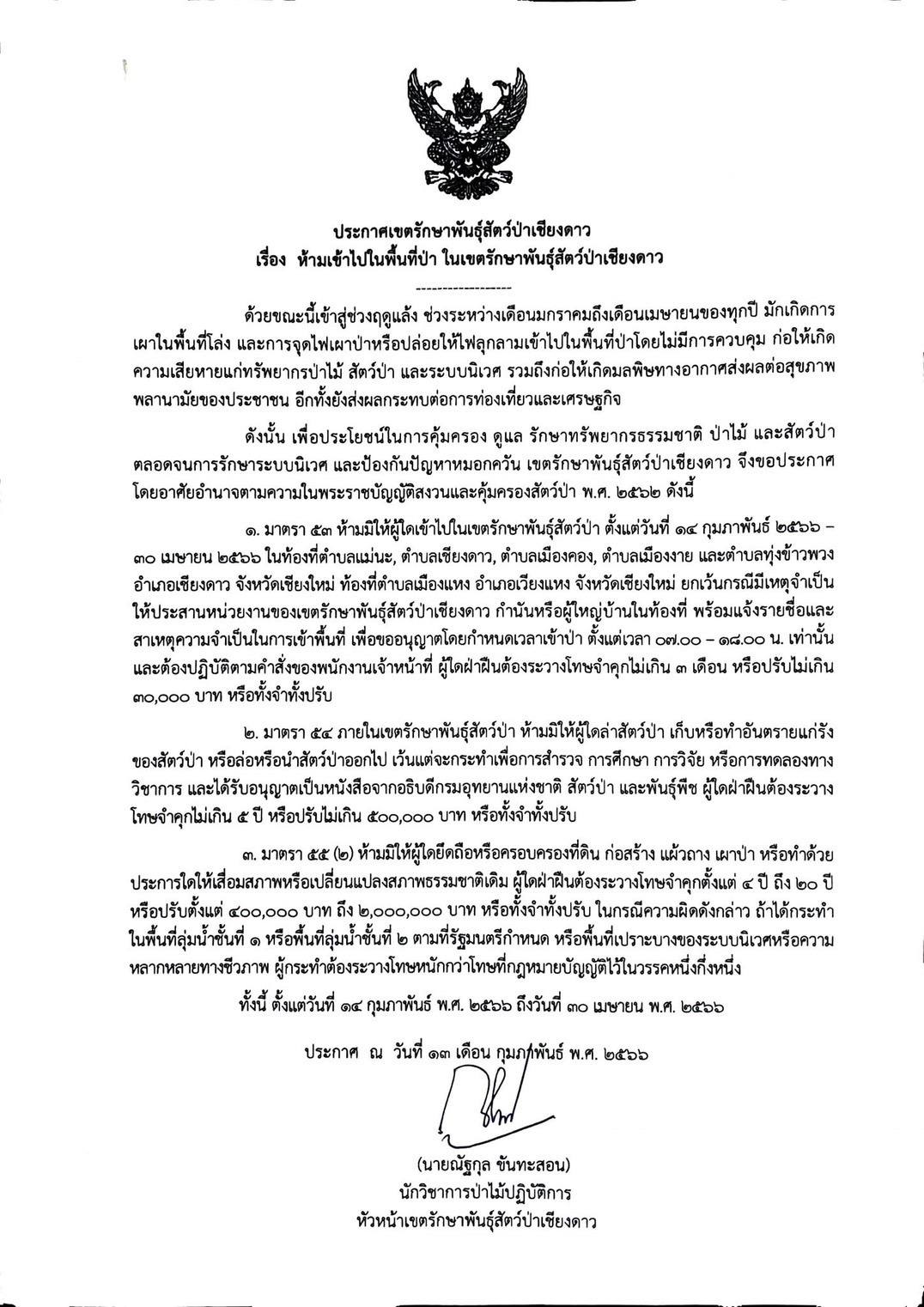 ล่าสุดวันที่ 14 ก.พ.66 เขตรักษาพันธุ์สัตว์ป่าเชียงดาว อ.เชียงดาว จ.เชียงใหม่ ออกประกาศห้ามเข้าไปในพื้นที่ป่า ในเขตรักษาพันธุ์สัตว์ป่าเชียงดาว เพื่อป้องกันการจุดไฟเผาป่าหรือไฟลุกลามเข้าพื้นที่ป่า ทำความเสียหายแก่ทรัพยากรป่าไม้ สัตว์ป่าและระบบนิเวศ รวมถึงก่อให้เกิดมลพิษทางอากาศส่งผลต่อสุขภาพ