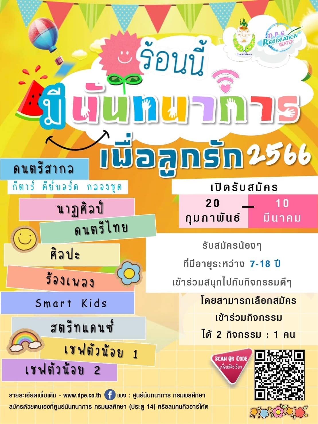 นอกจากนี้ สำนักนันทนาการ กรมพลศึกษา ยังเปิดรับสมัครเด็กและเยาวชน อายุตั้งแต่ 7-18 ปี เข้าร่วมกิจกรรมร้อนนี้มีนันทนาการเพื่อลูกรัก ประจำปี 2566 โดยจะเปิดรับสมัครที่ศูนย์นันทนาการ กรมพลศึกษา (ประตู 14 สนามศุภชลาศัย) หรือลงทะเบียนผ่านระบบออนไลน์ ตั้งแต่วันที่ 20 กุมภาพันธ์-10 มีนาคม 2566 ทางระบบของศูนย์นันทนาการกรมพลศึกษาเท่านั้น