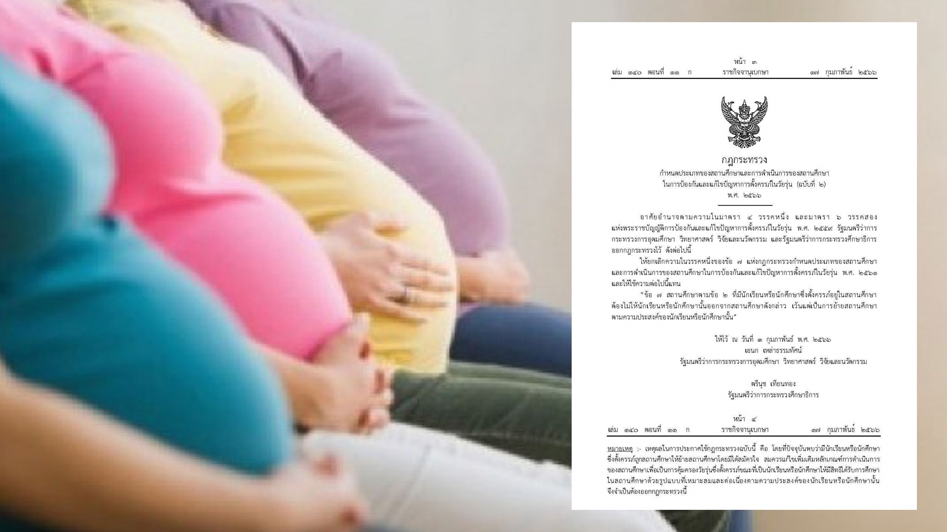 “ข้อ 7 สถานศึกษาตามข้อ 2 ที่มีนักเรียนหรือนักศึกษาซึ่งตั้งครรภ์อยู่ในสถานศึกษา ต้องไม่ให้นักเรียนหรือนักศึกษานั้น ออกจากสถานศึกษาดังกล่าว เว้นแต่เป็นการย้ายสถานศึกษา ตามความประสงค์ของนักเรียนหรือนักศึกษานั้น” ในท้ายกฎกระทรวง ระบุเหตุผลในการประกาศใช้กฎกระทรวงฉบับนี้ว่า โดยที่ปัจจุบันพบว่ามีนักเรียนหรือนักศึกษาซึ่งตั้งครรภ์ถูกสถานศึกษาให้ย้ายสถานศึกษาโดยมิได้สมัครใจ สมควรแก้ไขเพิ่มเติมหลักเกณฑ์การดําเนินการของสถานศึกษา เพื่อเป็นการคุ้มครองวัยรุ่นซึ่งตั้งครรภ์ขณะที่เป็นนักเรียนหรือนักศึกษา ให้มีสิทธิได้รับการศึกษาในสถานศึกษา ด้วยรูปแบบที่เหมาะสมและต่อเนื่อง ตามความประสงค์ของนักเรียนหรือนักศึกษานั้น จึงจำเป็นต้องออกกฎกระทรวงนี้ สำหรับสถานศึกษาตามข้อ 2 ประกอบด้วย (1) สถานศึกษาที่จัดการศึกษาขั้นพื้นฐานในระดับ ดังต่อไปนี้( ก) ระดับประถมศึกษา (ข) ระดับมัธยมศึกษา(2) สถานศึกษาที่จัดการอาชีวศึกษาตามหลักสูตร ดังต่อไปนี้ (ก) ประกาศนียบัตรวิชาชีพ (ข) ประกาศนียบัตรวิชาชีพชั้นสูง(ค) ปริญญาตรีสายเทคโนโลยีหรือสายปฏิบัติการ (3) สถานศึกษาที่จัดการศึกษาในระดับอุดมศึกษา