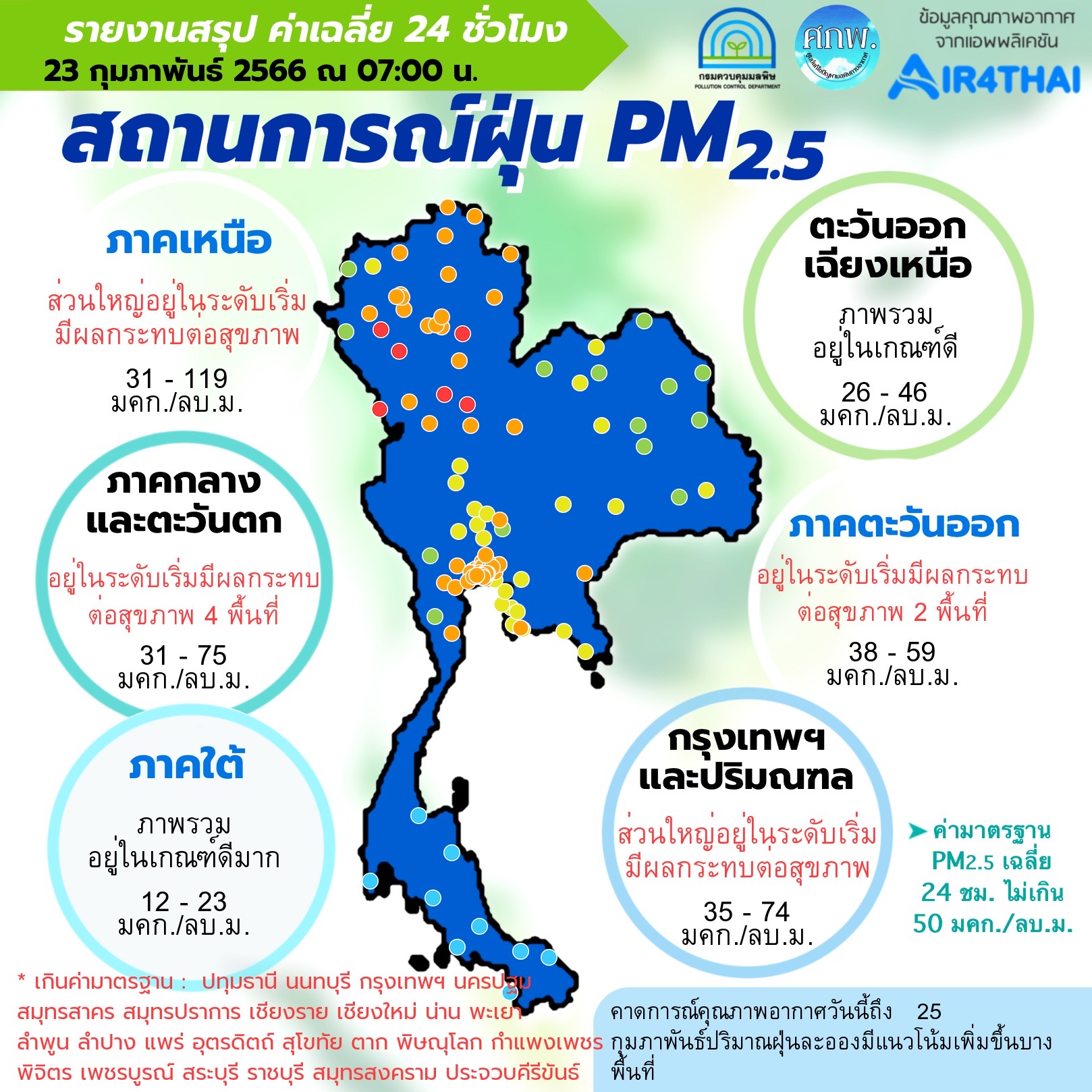 ภาพรวมปริมาณ PM2.5 ในประเทศพบเกินค่ามาตรฐานใน จ.ปทุมธานี จ.นนทบุรี กรุงเทพฯ จ.นครปฐม จ.สมุทรสาคร จ.สมุทรปราการ จ.เชียงราย จ.เชียงใหม่ จ.น่าน จ.พะเยา จ.ลำพูน จ.ลำปาง จ.แพร่ จ.อุตรดิตถ์ จ.สุโขทัย จ.ตาก จ.พิษณุโลก จ.กำแพงเพชร จ.พิจิตร จ.เพชรบูรณ์ จ.สระบุรี จ.ราชบุรี จ.สมุทรสงคราม จ.ประจวบคีรีขันธ์ จ.สระแก้ว และ จ. ระยอง