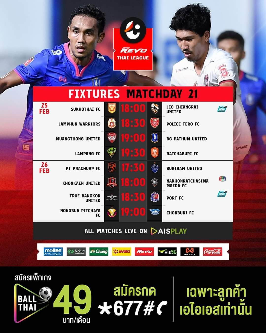 โปรแกรมฟุตบอล REVO THAI LEAGUE 2022/23 ประจำสัปดาห์ที่ 21 วันเสาร์ 25 กุมภาพันธ์ 2023