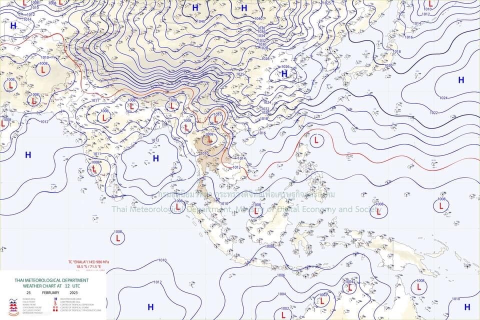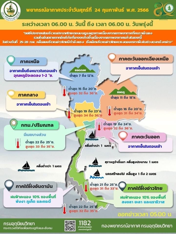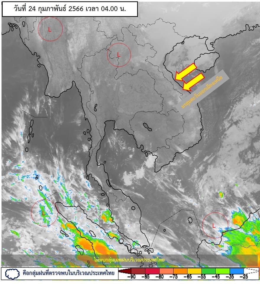 อนึ่ง ในช่วงวันที่ 25-28 ก.พ. 66 บริเวณความกดอากาศสูงหรือมวลอากาศเย็น กำลังแรงจากประเทศจีนจะแผ่เสริมลงมาปกคลุมประเทศไทยตอนบน และทะเลจีนใต้ ทำให้ประเทศไทยตอนบนมีอากาศหนาวเย็นลง อุณหภูมิจะลดลง 2-5 องศาเซลเซียส กับมีลมแรง ขอให้ประชาชนในบริเวณดังกล่าว ดูแลรักษาสุขภาพเนื่องจากสภาพอากาศที่หนาวเย็น รวมถึงอันตรายจากอัคคีภัยที่อาจจะเกิดขึ้น เนื่องจากสภาพอากาศแห้งในระยะนี้ ส่วนมรสุมตะวันออกเฉียงเหนือ ที่พัดปกคลุมอ่าวไทย ภาคใต้ และทะเลอันดามันจะมีกำลังแรงขึ้น ทำให้ภาคใต้ตอนล่างมีฝนเพิ่มขึ้น และมีฝนตกหนักบางแห่ง ส่วนคลื่นลมบริเวณอ่าวไทยมีกำลังแรง โดยมีคลื่นสูง 2-4 เมตร บริเวณที่มีฝนฟ้าคะนองคลื่นสูงมากกว่า 4 เมตร ส่วนทะเลอันดามันห่างฝั่งมีคลื่นสูง 1-2 เมตร ขอให้ประชาชนบริเวณภาคใต้ตอนล่าง ระวังอันตรายจากฝนตกหนักและฝนที่ตกสะสม ส่วนชาวเรือเดินเรือด้วยความระมัดระวัง และหลีกเลี่ยงบริเวณที่มีฝนฟ้าคะนอง ส่วนเรือเล็กบริเวณอ่าวไทย ควรงดออกจากฝั่งในช่วงเวลาดังกล่าว รวมทั้งระวังอันตรายจากคลื่นลมแรงที่ซัดเข้าหาฝั่งไว้ด้วย
