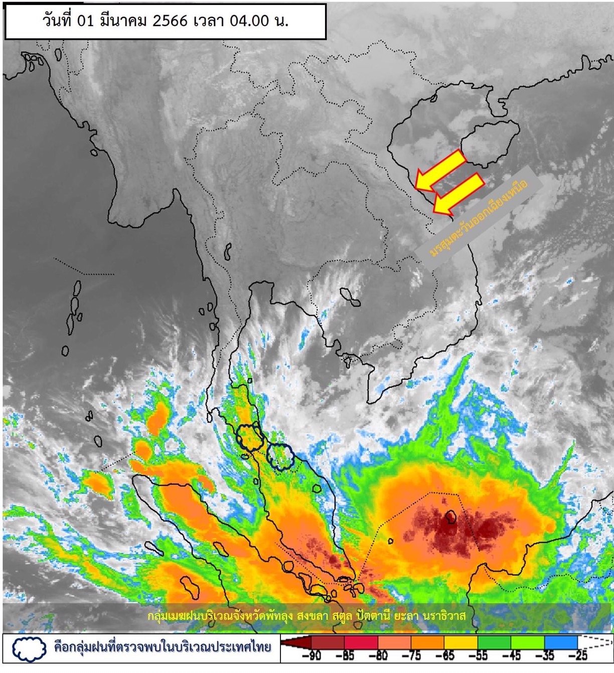 สำหรับมรสุมตะวันออกเฉียงเหนือกำลังแรงที่พัดปกคลุมอ่าวไทย ภาคใต้ และทะเลอันดามันเริ่มมีกำลังอ่อนลง แต่ยังคงทำให้ภาคใต้ตอนล่างมีฝนตกหนักบางแห่ง ขอให้ประชาชนบริเวณภาคใต้ตอนล่างระวังอันตรายจากฝนตกหนักและฝนที่ตกสะสม ซึ่งอาจทำให้เกิดน้ำท่วมฉับพลันและน้ำป่าไหลหลาก โดยเฉพาะพื้นที่ลาดเชิงเขาใกล้ทางน้ำไหลผ่านและพื้นที่ลุ่ม ส่วนคลื่นลมบริเวณอ่าวไทยตอนล่างมีคลื่นสูงประมาณ 2 เมตร บริเวณที่มีฝนฟ้าคะนองคลื่นสูงมากกว่า 2 เมตร ขอให้ชาวเรือบริเวณอ่าวไทยตอนล่างควรเดินเรือด้วยความระมัดระวังและหลีกเลี่ยงการเดินเรือในบริเวณที่มีฝนฟ้าคะนอง