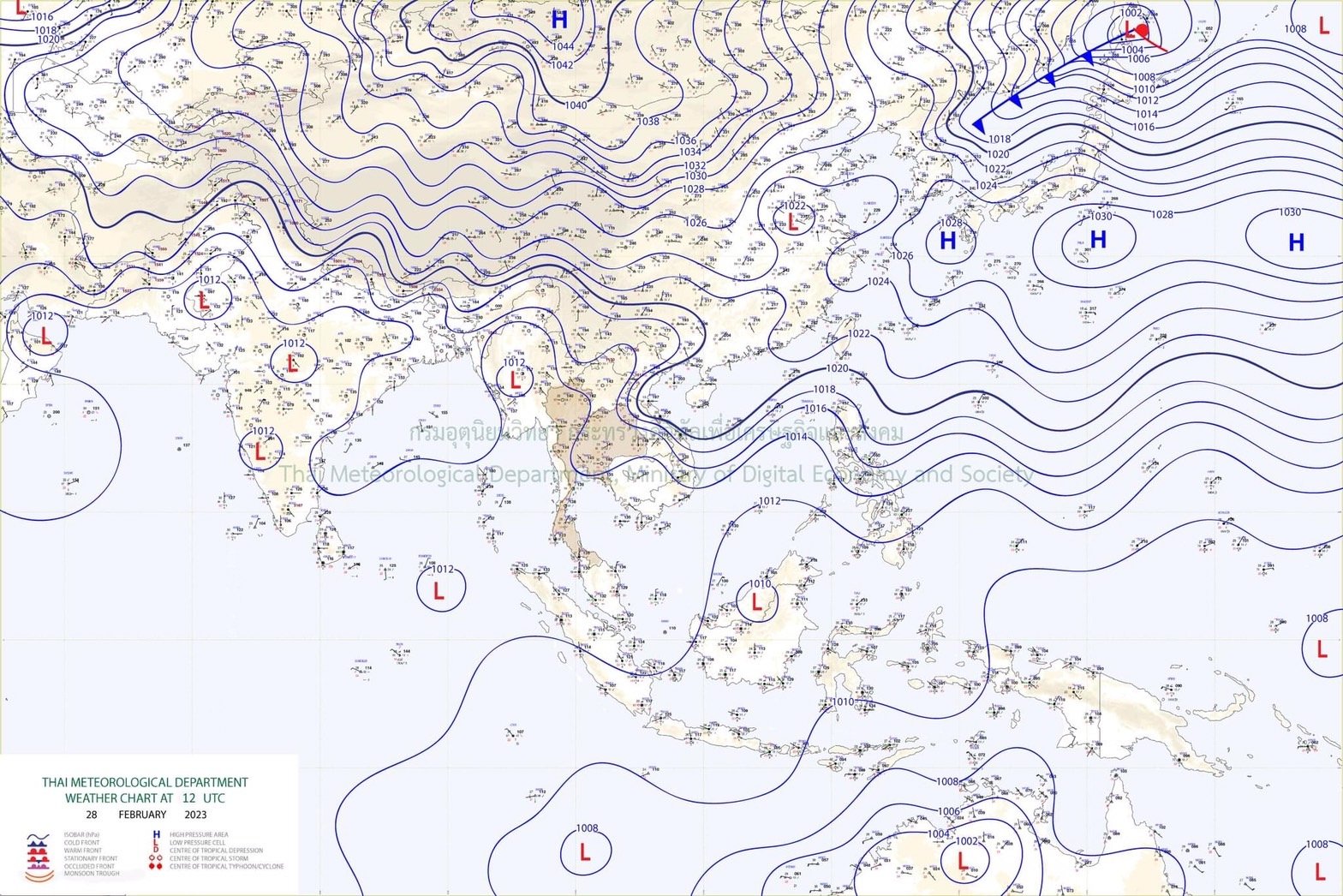 ลักษณะอากาศทั่วไป พยากรณ์อากาศ 24 ชั่วโมงข้างหน้า บริเวณความกดอากาศสูงหรือมวลอากาศเย็นที่ปกคลุมประเทศไทยตอนบนมีกำลังอ่อนลง อุณหภูมิจะสูงขึ้น 1-3 องศาเซลเซียสแต่ยังคงทำให้ภาคเหนือมีอากาศเย็นถึงหนาวในตอนเช้า ส่วนตะวันออกเฉียงเหนือ ภาคกลางรวมทั้งกรุงเทพมหานครและปริมณฑล และภาคตะวันออกมีอากาศเย็นในตอนเช้า ขอให้ประชาชนในบริเวณดังกล่าวดูแลรักษาสุขภาพเนื่องจากสภาพอากาศที่เปลี่ยนแปลง รวมถึงระวังอันตรายจากอัคคีภัยที่อาจจะเกิดขึ้นเนื่องจากสภาพอากาศแห้งในระยะนี้ไว้ด้วย