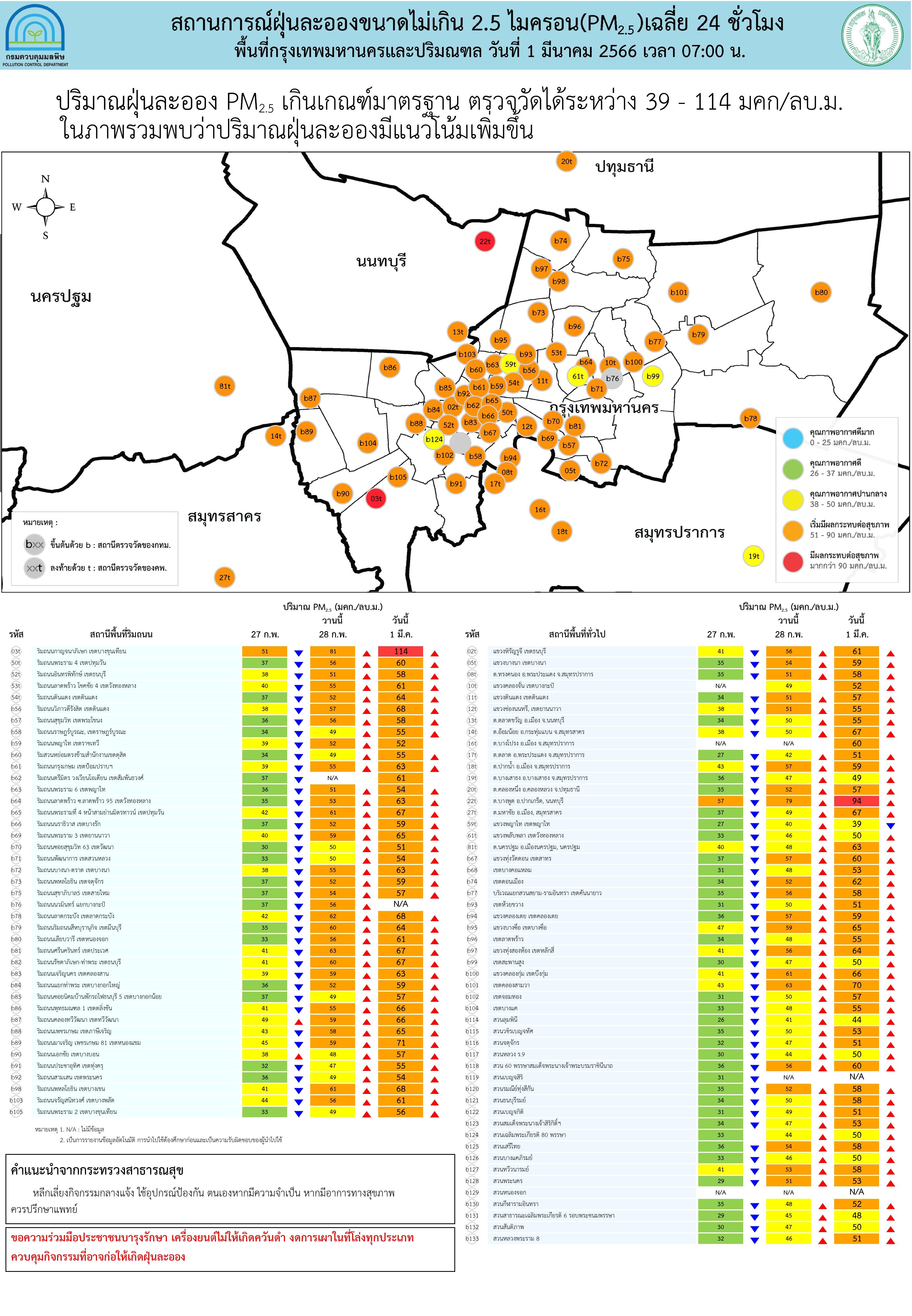 ภาพรวมปริมาณ PM2.5 ในประเทศพบเกินค่ามาตรฐานใน จ.ปทุมธานี กรุงเทพฯ จ.นนทบุรี จ.นครปฐม จ.สมุทรสาคร จ.สมุทรปราการ จ.เชียงราย จ.เชียงใหม่ จ.น่าน จ.แม่ฮ่องสอน จ.พะเยา จ.ลำพูน จ.ลำปาง จ.แพร่ จ.อุตรดิตถ์ จ.สุโขทัย จ.พิษณุโลก จ.กำแพงเพชร จ.พิจิตร จ.เพชรบูรณ์ จ.นครสวรรค์ จ.อุทัยธานี จ.สิงห์บุรี จ.สระบุรี จ.สุพรรณบุรี จ.ราชบุรี จ.สมุทรสงคราม จ.ประจวบคีรีขันธ์ จ.ชลบุรี จ.ระยอง จ.ตราด จ.บึงกาฬ จ.หนองคาย จ.เลย จ.นครพนม และ จ. หนองบัวลำภู