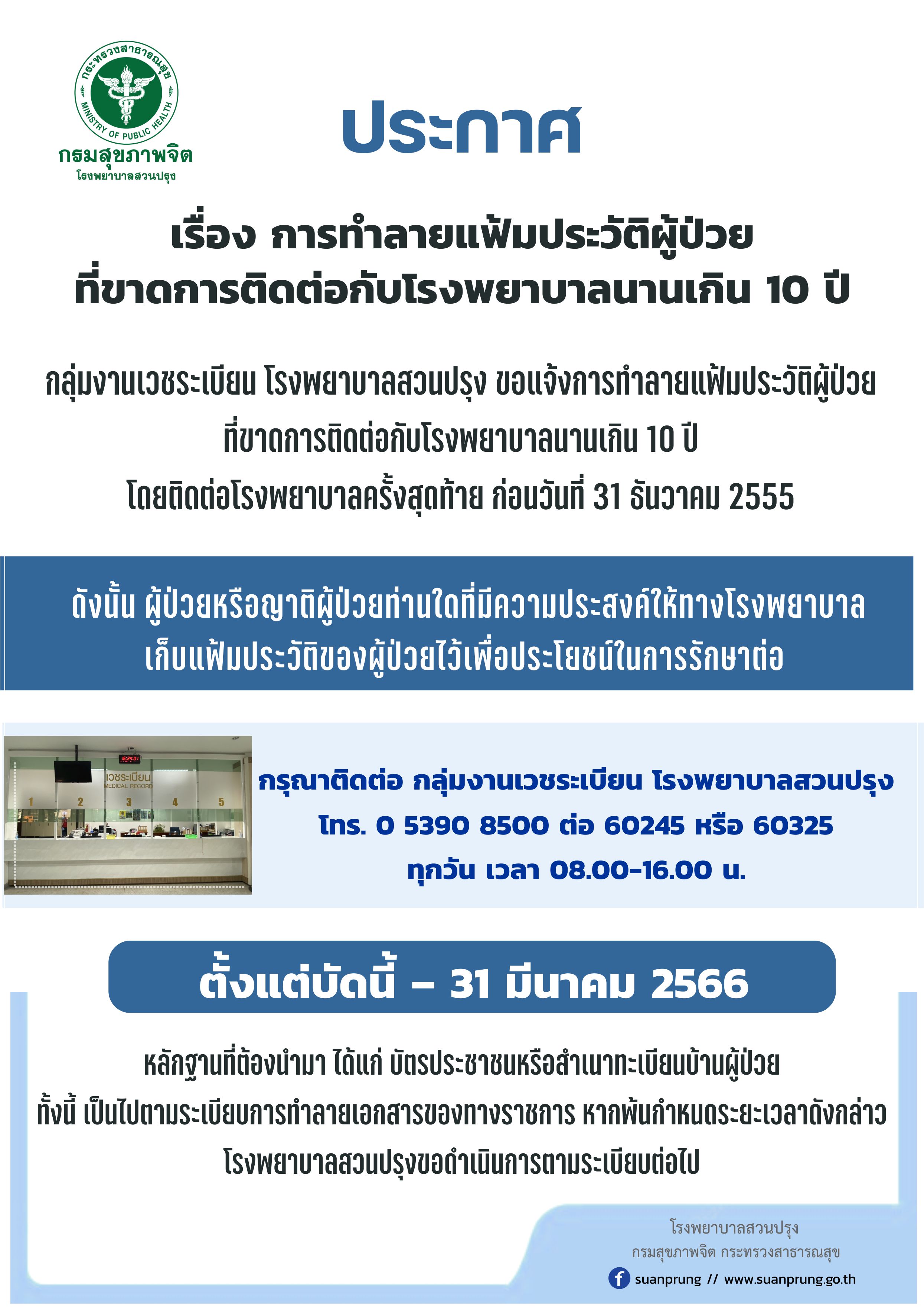 กลุ่มงานเวชระเบียน โรงพยาบาลสวนปรุง ขอแจ้งการทำลายแฟ้มประวัติผู้ป่วย