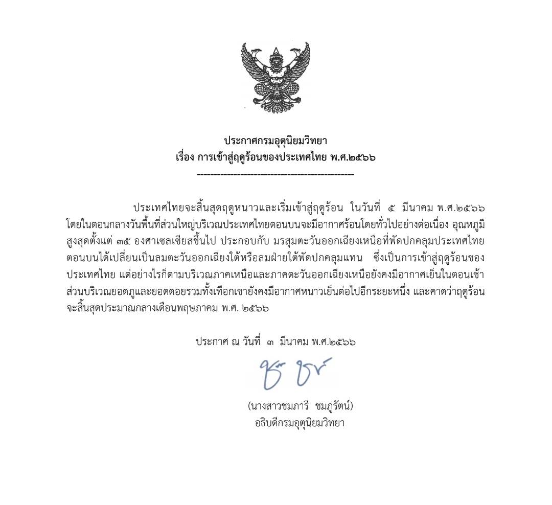 ประกาศกรมอุตุนิยมวิทยา “วันที่ 5 มีนาคม พ.ศ.2566 เข้าสู่ฤดูร้อนของประเทศไทย พ.ศ.2566”