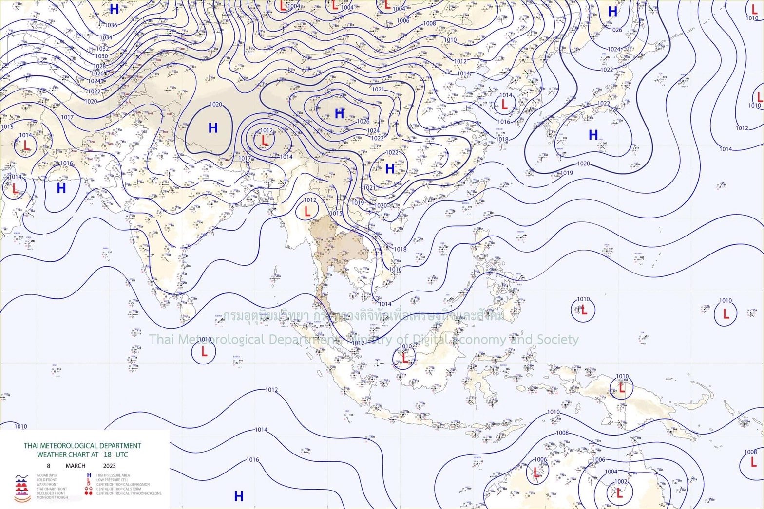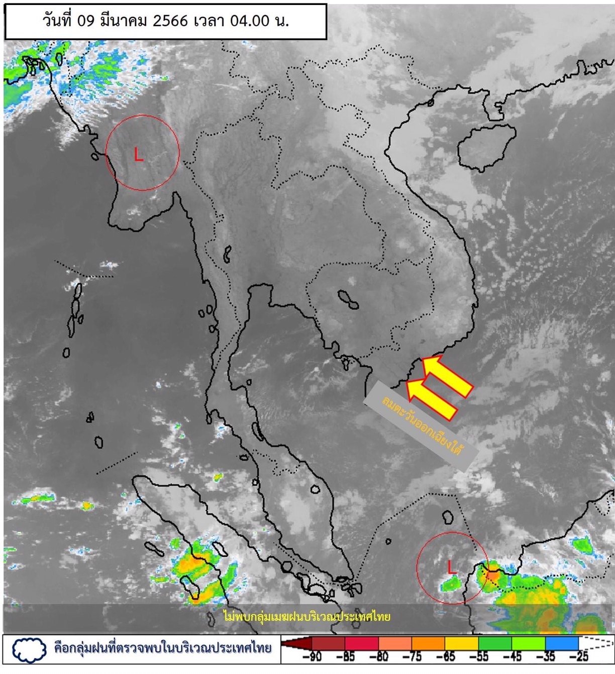 ลักษณะอากาศทั่วไป พยากรณ์อากาศ 24 ชั่วโมงข้างหน้า บริเวณความกดอากาศสูงหรือมวลอากาศเย็นกำลังอ่อน ปกคลุมภาคเหนือ ภาคตะวันออกเฉียงเหนือ และทะเลจีนใต้ ส่งผลทำให้มีลมตะวันออกและลมตะวันออกเฉียงใต้ พัดปกคลุมประเทศไทยตอนบน ทำให้ประเทศไทยตอนบนมีหมอกบางในตอนเช้า มีอากาศร้อนกับฟ้าหลัวในตอนกลางวัน แต่ยังคงมีอากาศเย็นในตอนเช้า บริเวณภาคเหนือ ภาคตะวันออกเฉียงเหนือ ภาคกลาง และภาคตะวันออก ขอให้ประชาชนในบริเวณดังกล่าว ดูแลรักษาสุขภาพเนื่องจากสภาพอากาศที่เปลี่ยนแปลงในระยะนี้ไว้ด้วย สำหรับลมตะวันออกพัดปกคลุมอ่าวไทยและภาคใต้ ทำให้ภาคใต้มีฝนบางแห่งเกิดขึ้นได้ ส่วนคลื่นลมบริเวณอ่าวไทยตอนล่าง มีคลื่นสูง 1-2 เมตร บริเวณที่มีฝนฟ้าคะนองคลื่นสูงมากกว่า 2 เมตร