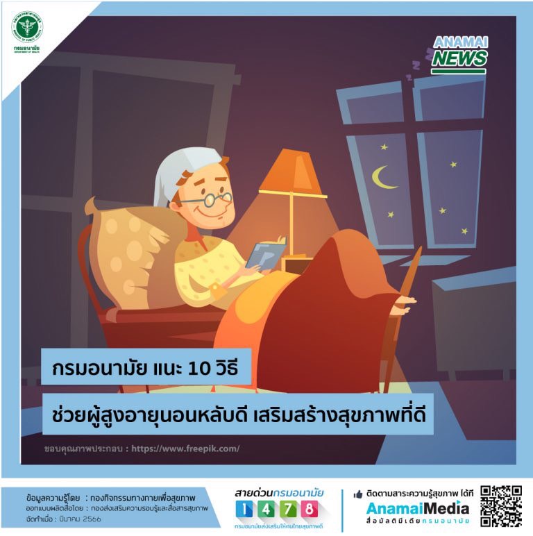 กรมอนามัย กระทรวงสาธาณสุข แนะ 10 วิธี ช่วยผู้สูงอายุมีสุขอนามัยการนอนหลับและสุขภาพที่ดี พร้อมชวนคนไทยทุกกลุ่มวัย หันมาใส่ใจการนอนหลับพักผ่อนให้เพียงพอและสม่ำเสมอ