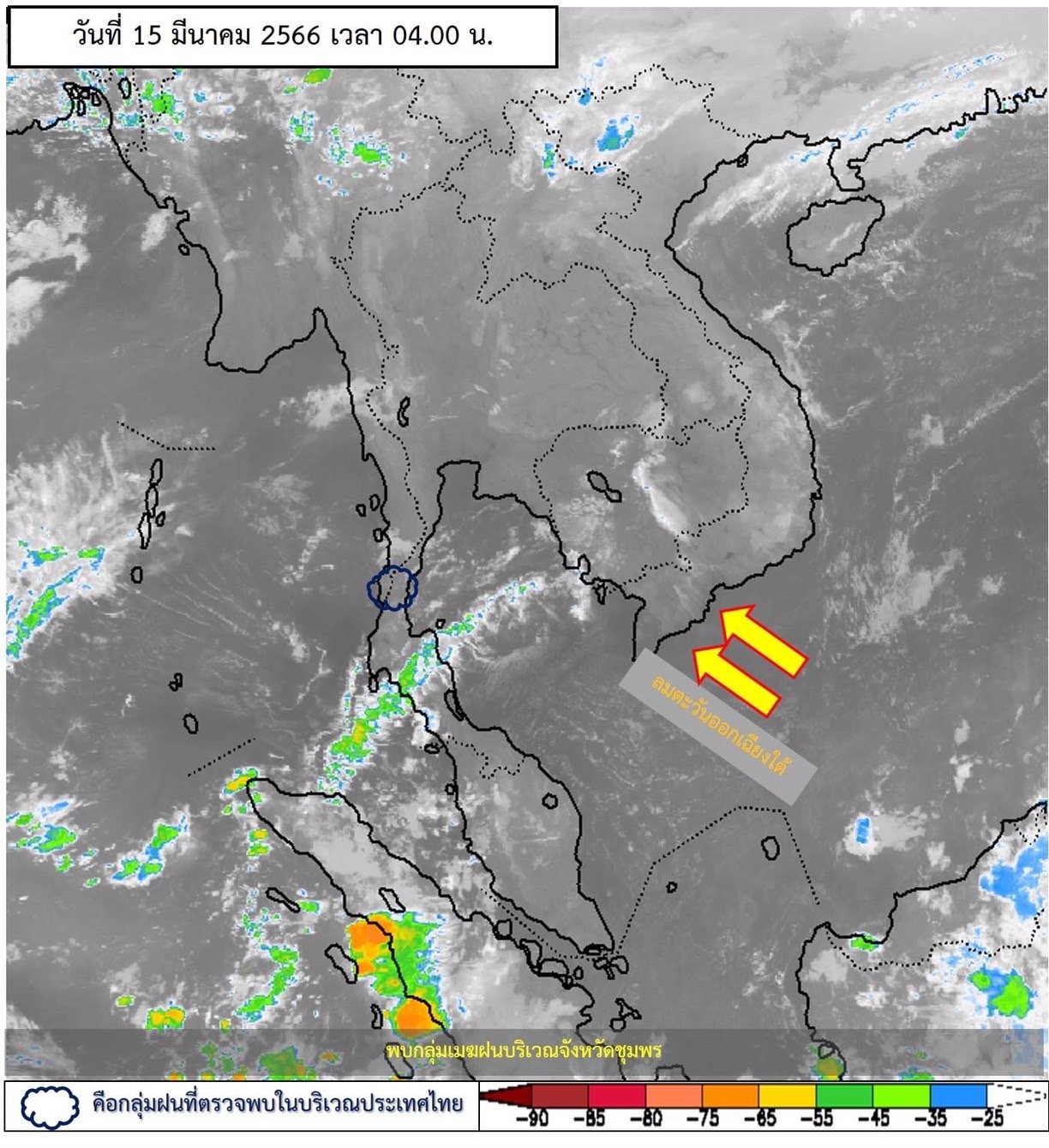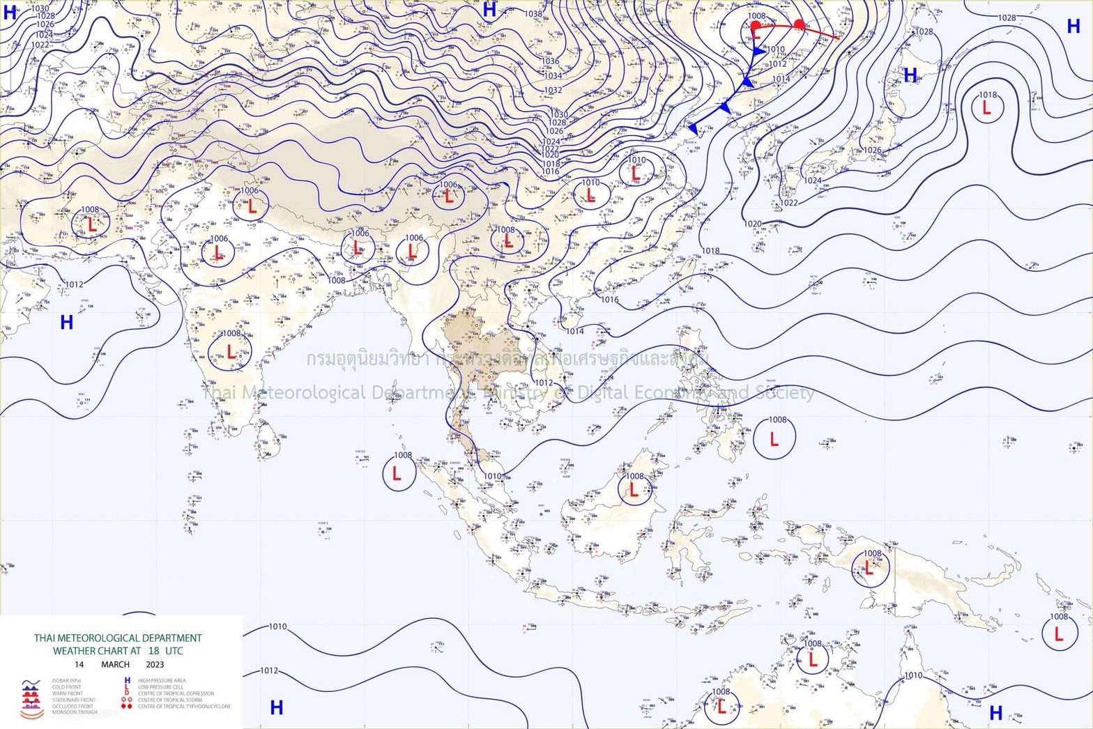 ลักษณะอากาศทั่วไป พยากรณ์อากาศ 24 ชั่วโมงข้างหน้า บริเวณความกดอากาศสูงหรือมวลอากาศเย็นกำลังปานกลาง ที่ปกคลุมประเทศไทยตอนบน และทะเลจีนใต้มีกำลังอ่อนลง แต่ยังคงทำให้ภาคเหนือและภาคตะวันออกเฉียงเหนือ มีอากาศเย็นกับมีหมอกบางในตอนเช้า ในขณะที่ลมตะวันออกและลมตะวันออกเฉียงใต้ พัดปกคลุมประเทศไทยตอนบน ลักษณะเช่นนี้ทำให้บริเวณดังกล่าวมีฝนเล็กน้อยบางแห่ง