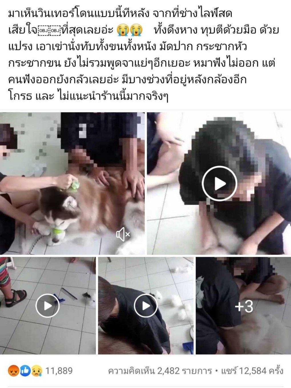 ทั้งนี้จากการสอบถาม น.ส.ใบเตย (นามสมมติ) อายุ35 ปี ชาวอำเภอหางดง จังหวัดเชียงใหม่ ซึ่งเป็นผู้ใช้เฟซบุ๊กและเจ้าของสุนัขตามคลิปดังกล่าว เปิดเผยว่า เมื่อวันที่ 28 เม.ย.66 ที่ผ่านมา นำสุนัขพันธุ์ไซบีเรียน ชื่อ วินเทอร์ ตัวผู้ อายุ 2 ปี ไปใช้บริการอาบน้ำตัดแต่งขนที่ร้านดังกล่าว ที่เพิ่งเคยนำไปใช้บริการเป็นครั้งแรก เนื่องจากดูข้อมูลโปรไฟล์แล้ว น่าเชื่อถือ เพราะเป็นช่างระดับอาจารย์ โดยเมื่อส่งเสร็จแล้วจากนั้นตัวเองได้ไปทำธุระต่อ แต่ปรากฏว่าระหว่างที่ทางร้านอาบน้ำตัดแต่งขนให้สุนัข ได้มีการไลฟ์สดและโทรศัพท์มาหาบอกว่าสุนัขขนเป็นสังกะตังอย่างรุนแรง อีกทั้งดื้อไม่เชื่อฟังและกัดด้วย พร้อมบอกให้ไปเปิดดูไลฟ์สดย้อนหลังได้ และให้ไปรับสุนัข จากนั้นตัวเองได้ไปเปิดดูและพบว่าทางร้าน มีการกระทำรุนแรง รวมทั้งใช้ถ้อยคำด่าทอสุนัขของตัวเองทำให้รู้สึกแย่มาก และเมื่อไปถึงที่ร้านเพื่อรับสุนัข ตัวเองยังถูกทางร้านต่อว่าอย่างรุนแรงอีก ว่าไม่ดูแลสุนัขให้ดี ซึ่งตัวเองไม่ได้เถียงและจะจ่ายค่าบริการ แต่ทางร้านปฏิเสธและยังคงตำหนิตัวเองอยู่ด้วยท่าทีที่ไม่ค่อยดีนัก ทำให้ต้องออกจากร้านมาก่อน โดยหลังจากนั้นได้นำเรื่องราวและคลิปหลักฐานไปปรึกษากับเพื่อนฝูงที่เป็นสัตวแพทย์ว่า การกระทำดังกล่าว เช่น ดึงหาง กระชากหัว หรือทุบ นั้น รุนแรงเกินกว่าเหตุหรือไม่ ซึ่งมีความเห็นตรงกันว่า เป็นสิ่งที่ไม่น่ากระทำ เพราะอาจทำให้สุนัขบาดเจ็บได้