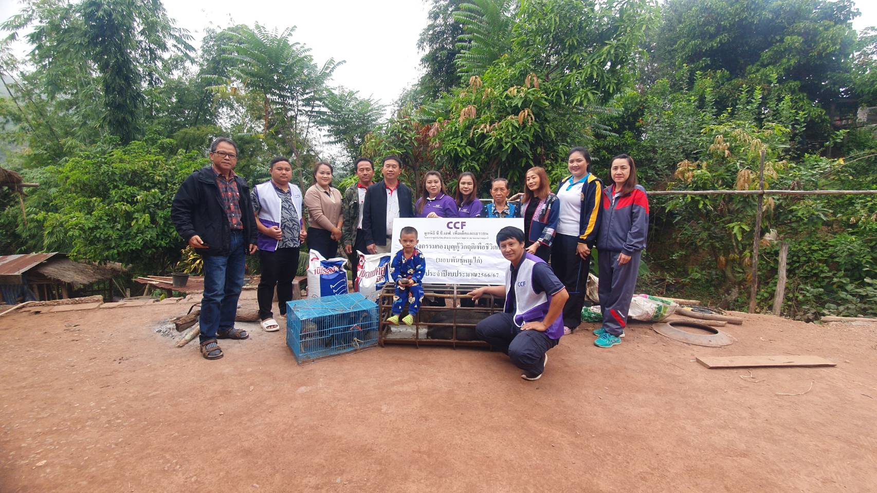 มูลนิธิ ซี.ซี.เอฟ. เพื่อเด็กและเยาวชน ในพระราชูประถัมภ์ สมเด็จพระเทพรัตนราชสุดาฯ สยามบรมราชกุมารี นำโดย นางสาวศุภาพิชญ์ สงคำ ผู้ประสานงานภาค นางสาวณัฏฐนิช คำดา เจ้าหน้าที่โครงการอาวุโส นายธนพงษ์ เจริญทรัพย์อนันต์ นายกเทศมนตรีตำบลท่าข้าม เจ้าหน้าที่ โรงพยาบาลส่งเสริมสุขภาพ ตำบลท่าข้าม ร่วมกันจัดกิจกรรมกองบุญกู้วิกฤติ เพื่อชีวิตเด็ก (มอบพันธุ์หมู ไก่) ประจำปีงบประมาณ 2566/67 ให้กับครอบครัวของ น้อง ณภัทร (ด.ช.ณภัทร แซ่ย่าง ) อายุ 4 ปี อยู่ที่ 299 ม2 ต.ท่าข้าม อ.เวียงแก่น จ.เชียงราย โดยได้มอบหมูดำจำนวน 2 ตัว ไก่พ่อแม่พันธุ์ จำนวน 10 ตัว พร้อมอาหารสำหรับ หมูและไก่