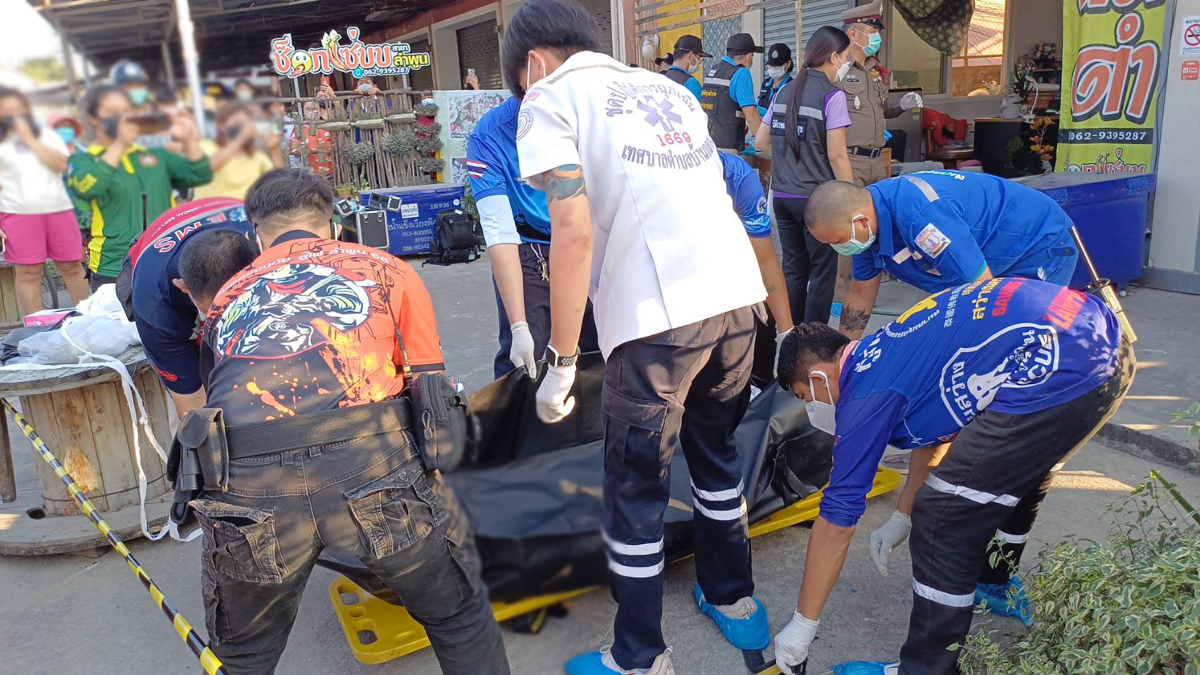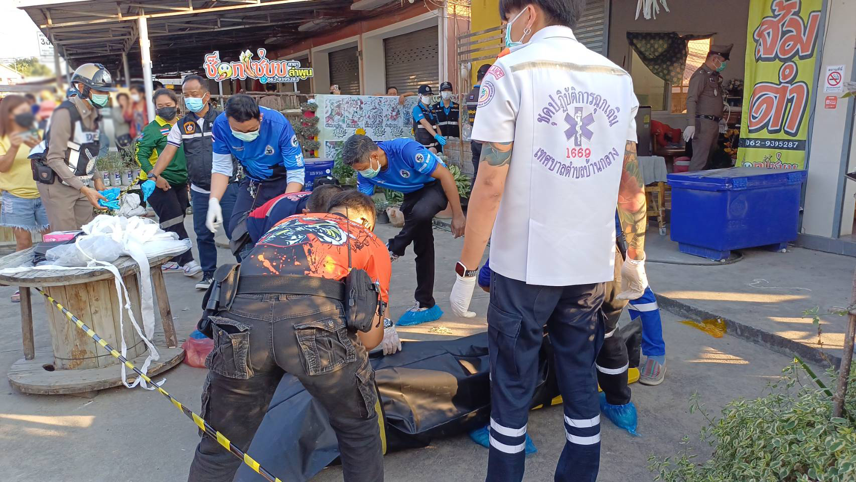 ในที่เกิดเหตุห้องพักเป็นร้านขายส้มตำ มีกลิ่นเหม็นอย่างรุนแรง เมื่อเปิดประตูเข้าไปพบผู้เสียชีวิต 3 พ่อแม่ลูกนอนอยู่บนที่นอน สภาพศพเน่าเฟะ เสียชีวิตมาแล้วไม่ต่ำกว่า 1 สัปดาห์สภาพศพเละและส่งกลิ่นเหม็นตลบอบอวลเต็มไปหมด เจ้าหน้าที่กันไม่ให้ใครเข้า และในห้องยังพบเตาอั้งโล่ถ่านมอดแล้ว เตาแก้สปิคนิค 1 ถัง และมีสายไฟฟ้ามัดมือ นาย วสุภัทร (สงวนนามสกุล) อายุ 48 ปี ชาว ต.เวียงยอง อ.เมือง จ.ลำพูน นอนตรงกลาง และด้านขวามือพบสายไฟฟ้านิ้วของ นาง อรณัชชา (สงวนนามสกุล) อายุ 47 ปี ภรรยา และมือซ้ายของนายวสุภัทร พาดไปยัง ด.ช.ธนวิน (สงวนนามสกุล) อายุ 12 ปี