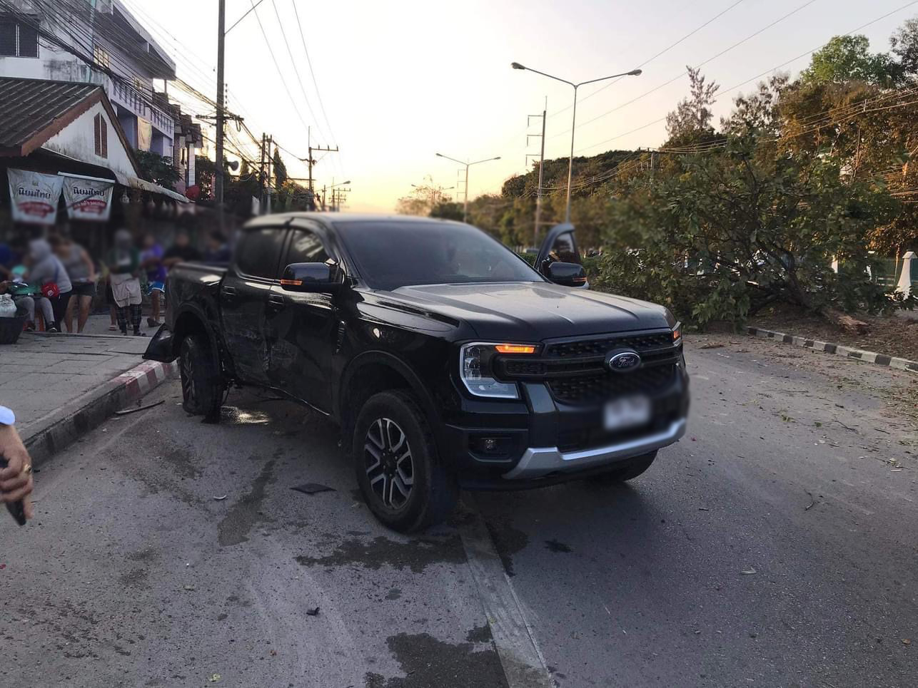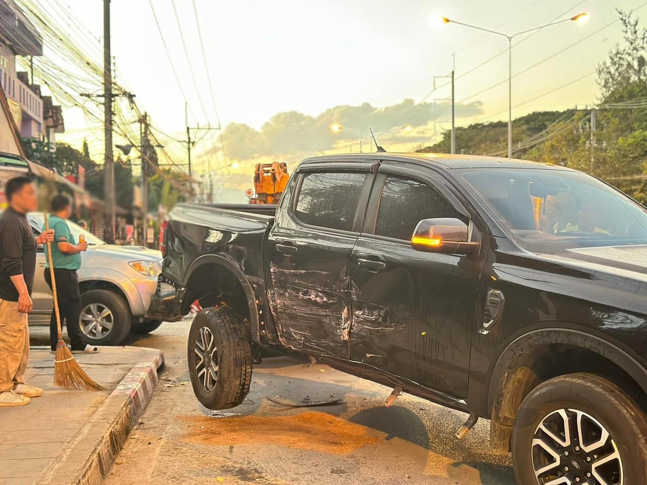 จากการสอบถามผู้เห็นเหตุการณ์ ทราบเบื้องต้นว่า ก่อนเกิดเหตุรถยนต์กระบะคันสีขาวนั้นได้ขับมาตามเส้นทางมุ่งหน้าไปทางหลิ่งมื่น โดยได้ขับมาด้วยความเร็วแข่งกับรถยนต์อีกคันบนถนน จนกระทั่งมาถึงยังบริเวณจุดเกิดเหตุ รถได้เสียหลักพุ่งข้ามเลนมาชนเข้ากับทางรถยนต์กระบะฟอร์ดสีดำ ที่อยู่อีกเลนจนกระเด็นและพุ่งชนเข้ากับรถจักรยานยนต์ที่ขับมาอีกคัน จนทำให้ได้รับบาดเจ็บกันระนาว