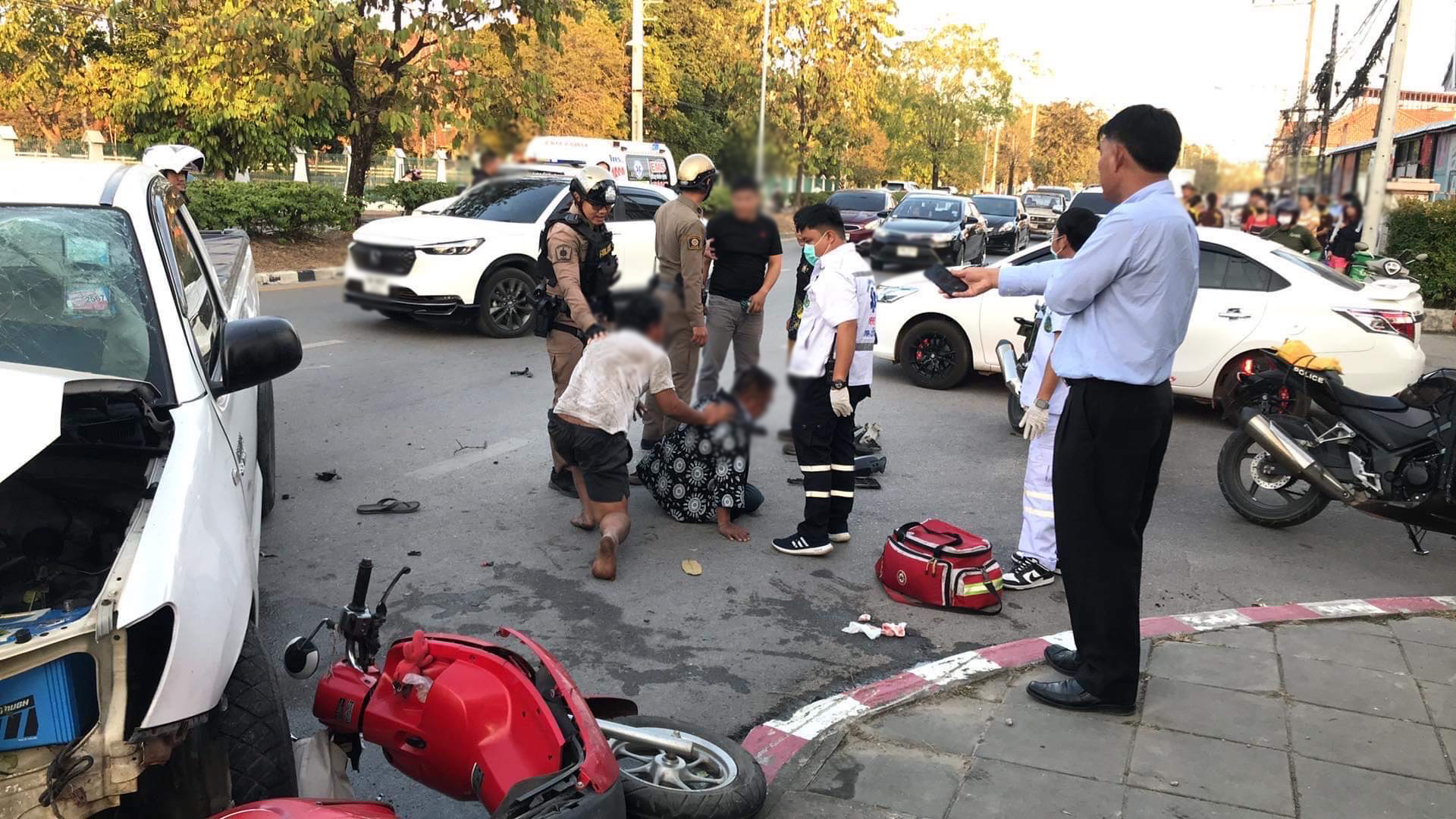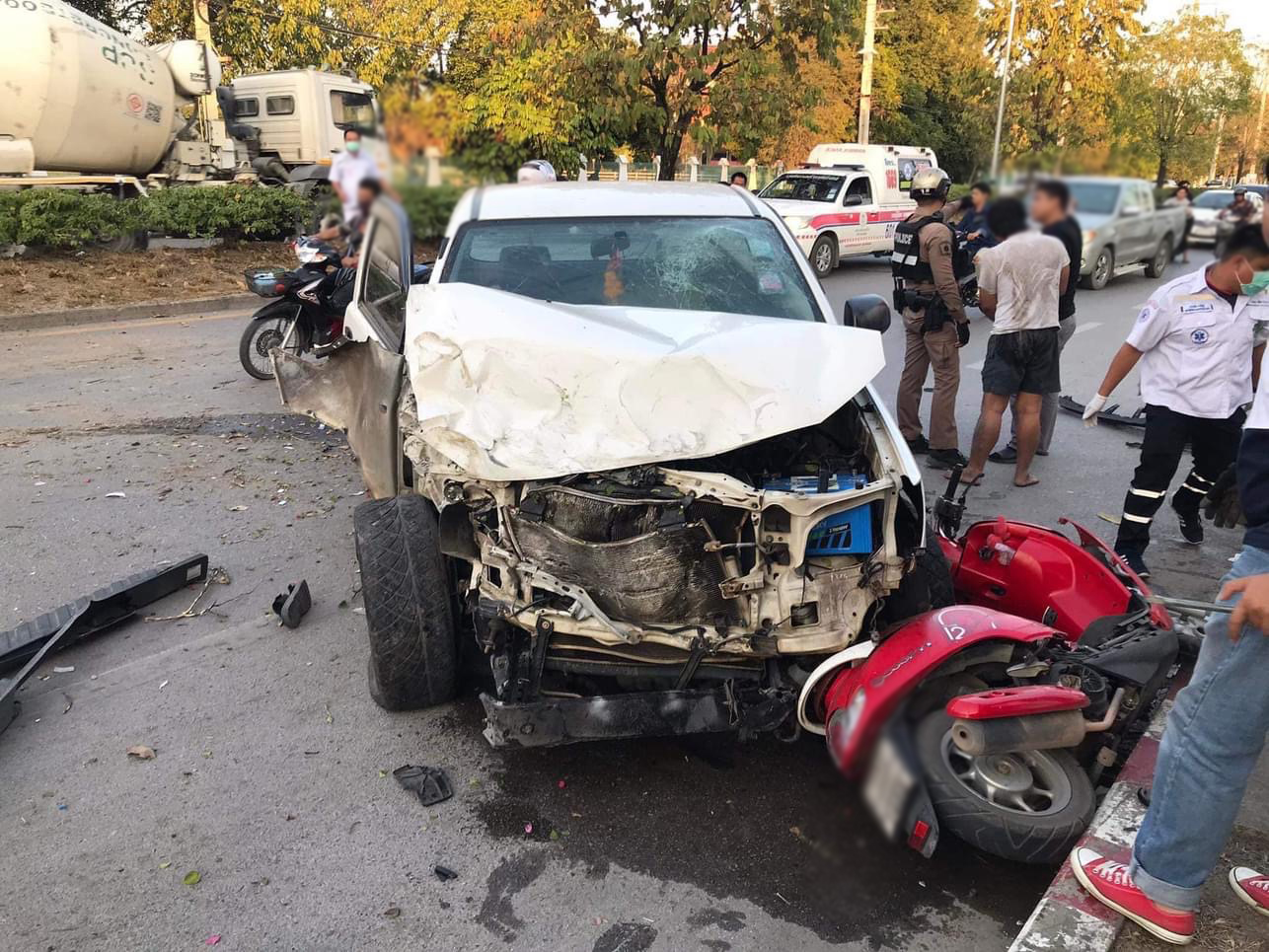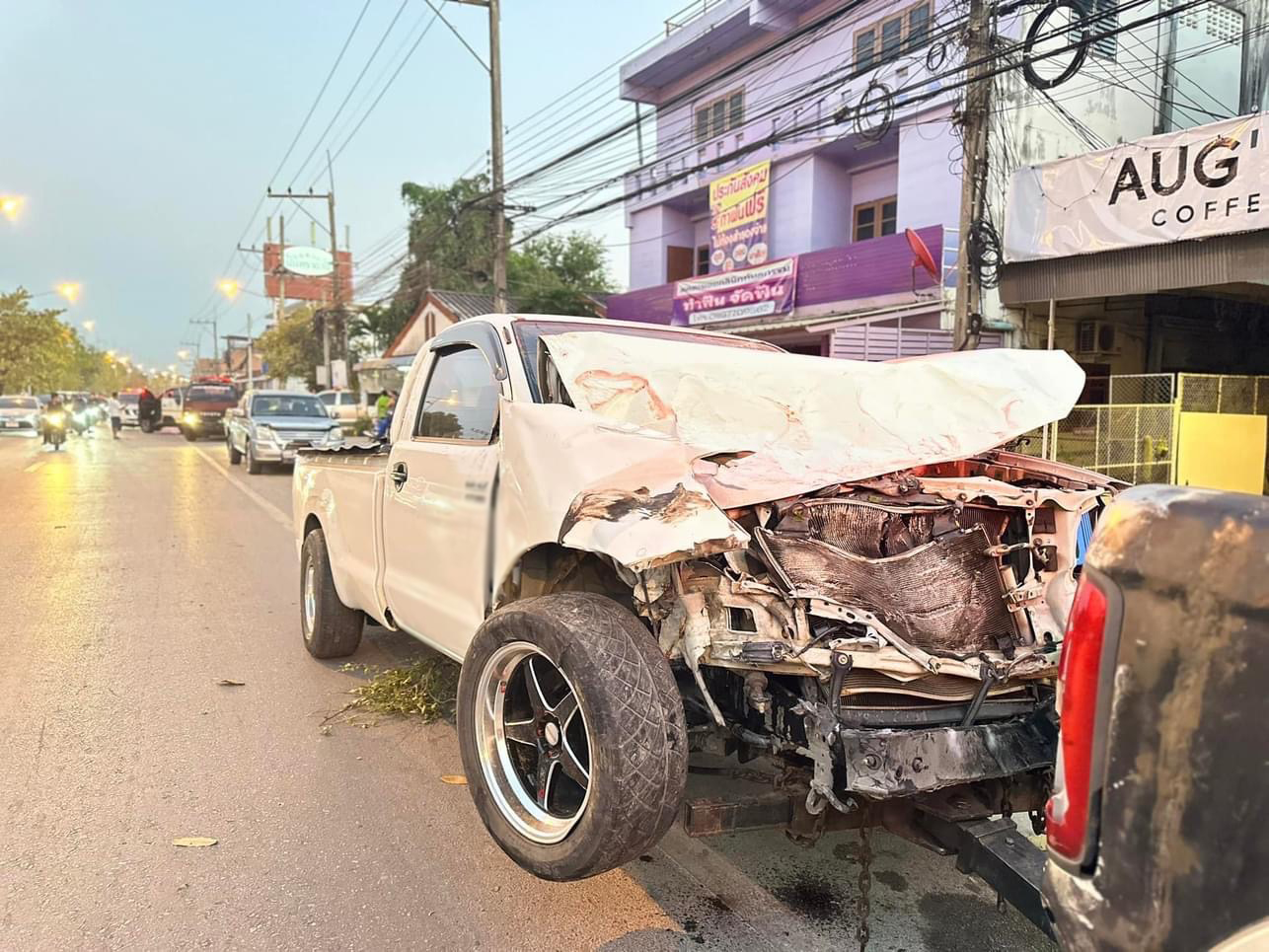 เจ็บระนาว หนุ่มเมาแต่หัวค่ำ ซิ่งกระบะข้ามเลน พุ่งชนรถยนต์และรถจักรยานยนต์พังยับ พบในรถมีขวดสุรา ชาวบ้านพากันรุมประชาทัณต์ จนเจ้าหน้าที่จำรวจต้องเข้ามาห้าม