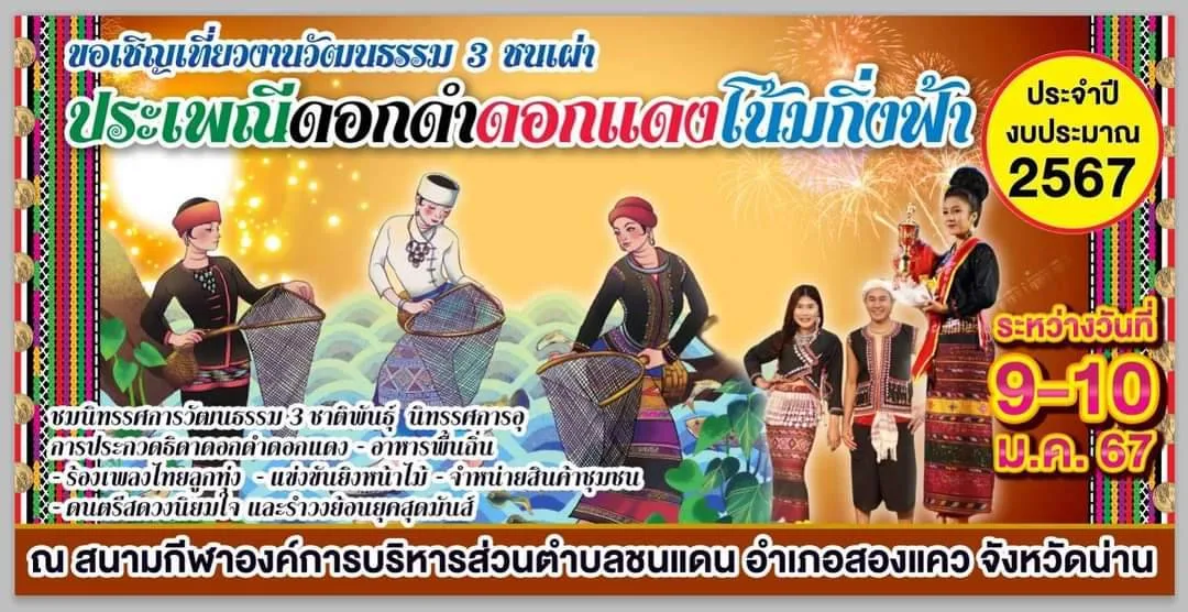 งานวัฒนธรรมสามชนเผ่า #ประเพณีดอกดำดอกแดงโน้มกิ่งฟ้า #อบต.ชนแดน #เปิดฤดูกาลท่องเที่ยวน่าน #ท่องเที่ยวชุมชน #เส้นทางท่องเที่ยวสร้างสรรค์ #สัมผัสผ้าและวิถีสโลว์ไลฟ์ #หนาวนี้ที่น่าน #เสน่ห์น่านวันนี้ I ❤️ NAN