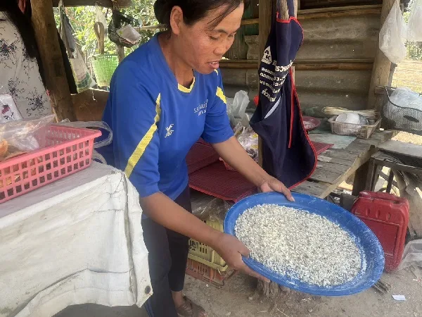 แม่ค้าคนหนึ่ง บอกว่า ขายไข่มดแดง แก้วละ 50 บาท ส่วนผักหวานป่า ห่อละ 20 บาท 3 ห่อ 50 บาท ส่วนยอดรายได้รวม ขายได้มากหรือน้อยอยู่ที่จำนวนไข่มด และผักหวานที่จะหามาได้ บางวันขายได้มากถึง 1,000 บาท ก็เคยขายได้มาแล้ว